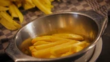 Schil de aardappelen, of schrob ze schoon. Gebruik ongeveer 250 gram per persoon. Snij ze in plakken van 1-1,5 cm dik en snij die plakken ook in repen van 1-1,5 cm dik. Leg ze enkele minuten in ijskoud water om het zetmeel eraf te wassen, zodat ze straks nog knapperiger worden. Droog ze vervolgens goed af in een schone theedoek.
