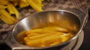 Verhit voor het serveren de olie tot 190 graden en bak de frieten weer in kleine porties af tot ze goudkleurig en knapperig zijn. Reken op ongeveer 3 tot 4 minuten per portie. Bestrooi ze met wat zeezout.