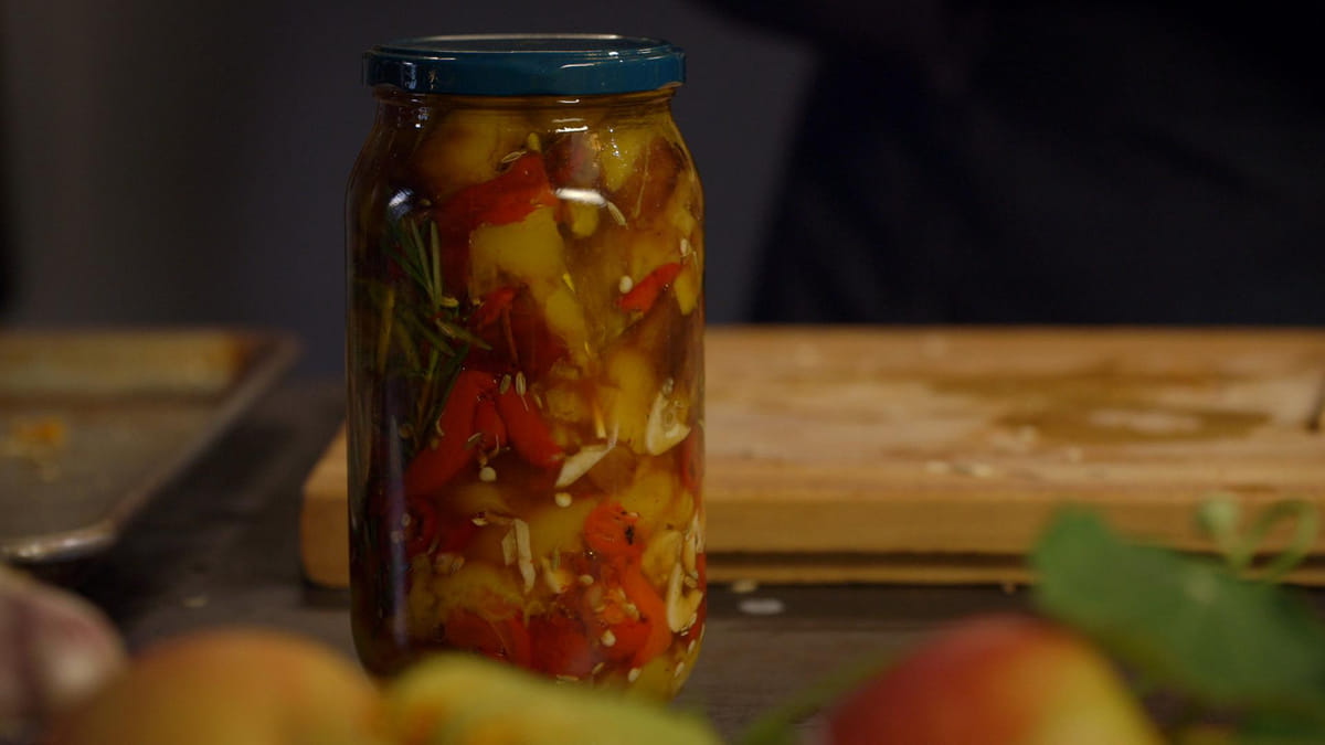 Snijd de pepers in dunne ringen en de knof in dunne plakjes. Prop de paprika’s in een brandschone glazen pot, wissel de laagjes af met zout, pepers, knof en venkelzaad, steek eventueel nog een lekkere tak rozemarijn erin. Overgiet met genoeg olijfolie tot de pot vol is. Klop een aantal keer met de pot op het aanrecht, om de luchtbellen eruit te laten. Breek natgemaakte 2 satéstokjes bijna doormidden en druk ze kruislings boven in de pot. Zo blijven de paprika’s goed onder de olie staan en drijven ze er niet boven uit.