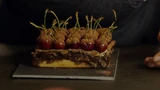 Haal de vorm uit de koelkast en Giet de warme saus over de vulling. Zet de bakvorm op een grotere bakplaat tegen het overstromen, en zet de boel in de oven. Bak de koek ongeveer 30 minuten, tot de karamel langs de randen heftig borrelt maar het centrum van de koek nog net niet. Haal hem uit de oven.