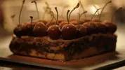 Laat hem nu op een rooster afkoelen tot kamertemperatuur en zet hem dan in de koelkast om in zeg 4 uur verder op te stijven. Snij de koek dan in kleine gelijke stukken met een groot glad mes.