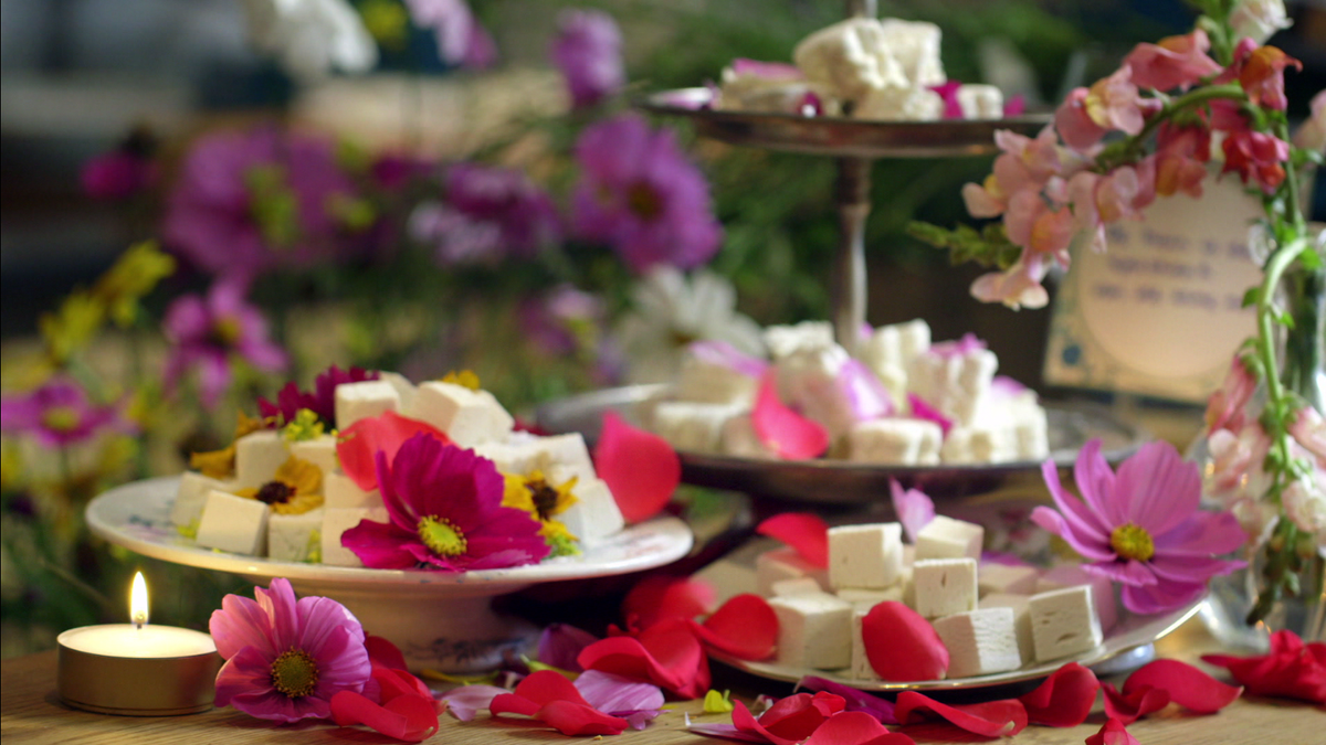 Knijp de gelatineblaadjes uit en leg ze onderin de kom van een keukenmachine met garde en zet de machine aan op de middenstand. Giet in een dunne straal de hete siroop erbij. Als het mengsel witter wordt kun je ‘m harder zetten. Blijf nu stevig kloppen tot het dik wit schuim is en tot de kom lauw aanvoelt. (± 15 minuten).