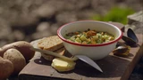 Doe eerst mosselen en aardappelblokjes in de kom en schep dan de romige soep er omheen. Bestrooi met nog wat bieslook en peterselie. Eet er knapperig brood bij.