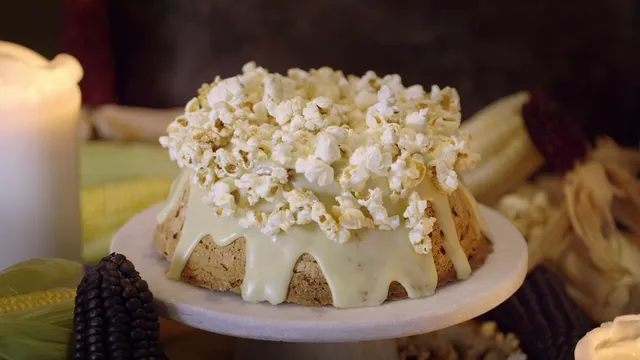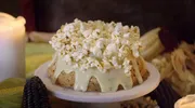Plak de popcorn er overal goed op. Dien de cake dan meteen op.