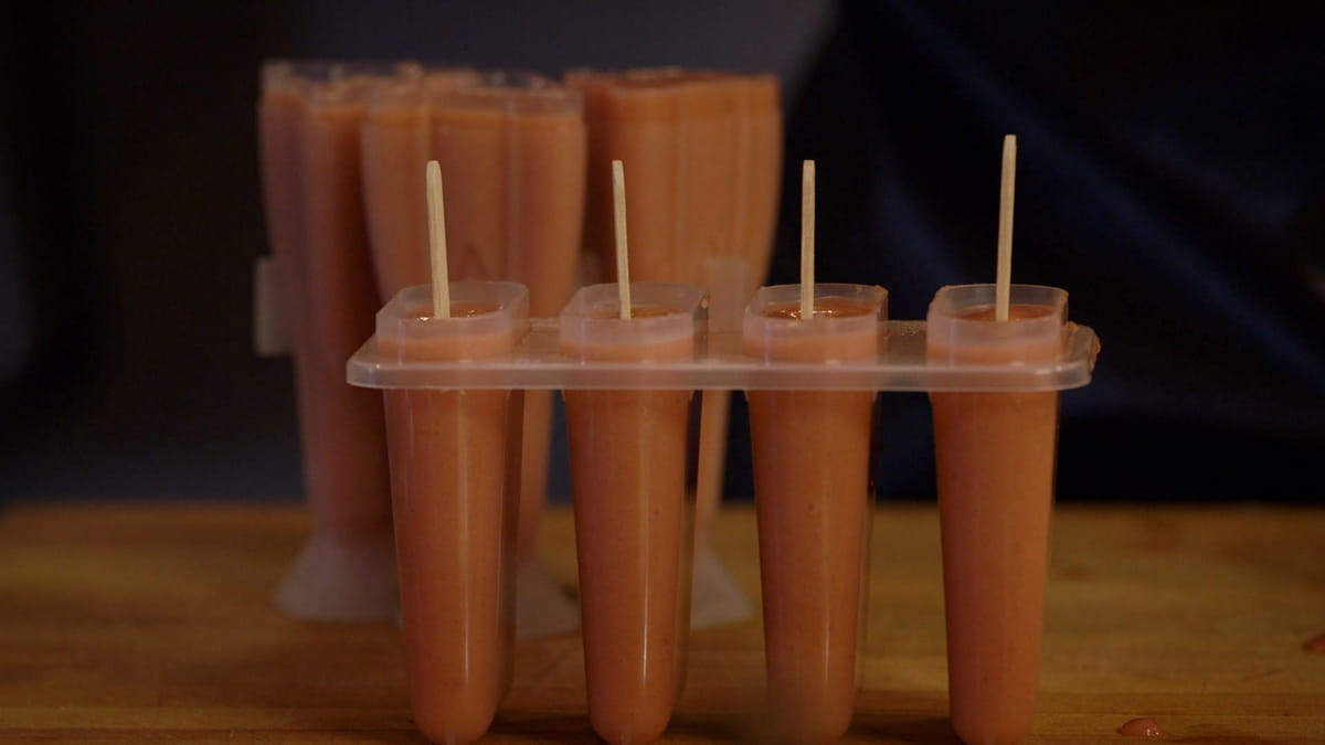 Doe het dan in de blender (of keukenmachine) en draai het kort tot het mooi glad is. Voeg de gin toe en draai nog eens kort. Vul ongeveer 6 ijslolly-vormpjes met het rabarber-gin mengsel. Steek er direct al stokjes in, dat kan omdat het mengsel vrij dik is. Zet zeker 4 uur in de vriezer om op te stijven.