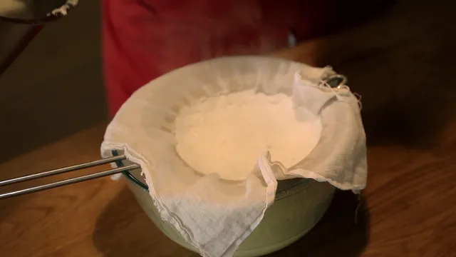 Vermeng de geitenmelk met het citroensap, het korianderzaad en het zout tot de melk schift. Laat ’m dan 3 minuten zacht koken, zodat de wei (het heldere deel) zich goed scheidt van de wrongel (het witte deel).