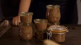 Vul brandschone potjes met de rillettes. Smelt voldoende (zeker 150 gram) reuzel in een klein pannetje en giet dat over de potjes uit. Druk de dekseltjes erop en laat het vet goed stollen. Bewaar rillettes op een koele plaats, het blijft best wel even goed.