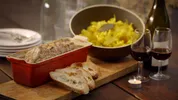 Verwarm de oven voor op 150 graden, zet de terrine het liefst op een bakplaatje tegen het lekken en braad hem ongeveer 1 uur of tot hij gaar is en het vet om hem heen lekker bubbelt.