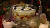 Breek de cake in grove brokken en verdeel de helft ervan over de bodem van de schaal. Druppel er de helft van de cocktail over. Giet de helft van de custard erop, zet de mandarijntjes met hun doorgesneden kant rondom langs de zijkant van de schaal voor het glas. Schep de jam over de custard en bedek alles met nog een laag cake. Schenk de rest van de cocktail erop. Schep daar weer de rest van de custard over. Zet de boel in de koelkast tot het serveren. Doe dit het liefst een avond van tevoren, dan kunnen de smaken goed intrekken.