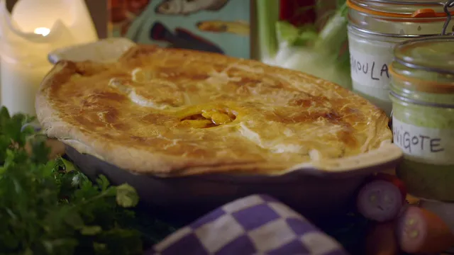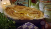 Rol het bladerdeeg uit op de maat van de schaal, maak een gaatje in het midden, smeer wat geklopt ei over de rand en pas het deeg erop. Versier en smeer het deeg in met de rest van het ei.