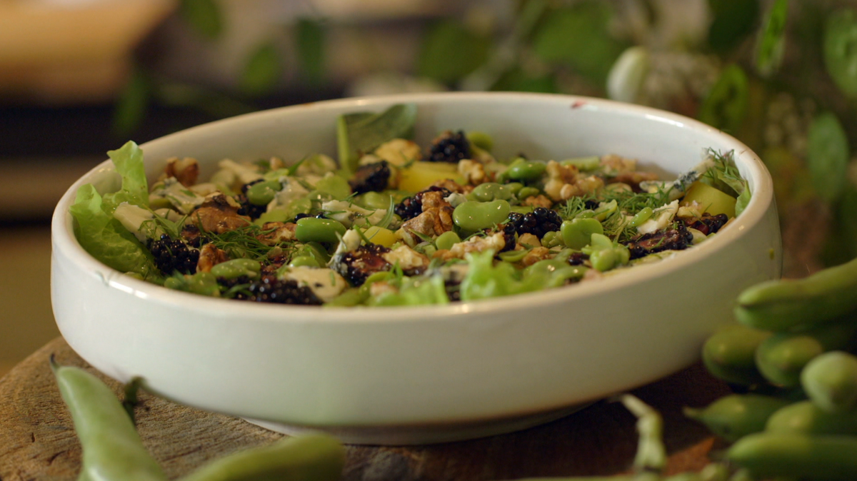 Recept: Yvette's maaltijdsalade met bramen, tuinbonen en gorgonzola