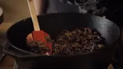 Verhit de olie in een pan met zware bodem tot hij lekker heet is. Fruit de uitjes met de komijn- en chilipoeder, voeg de knoflook en de zwarte bonen toe. Bak op hoog vuur al omscheppend en prakkend. De bonen moeten een beetje pureren ook. Breng op smaak met zout en peper en verdun eventueel met een scheutje water als het naar uw smaak te droog is. Serveer met andere lekkere dingen in een verse tortilla.