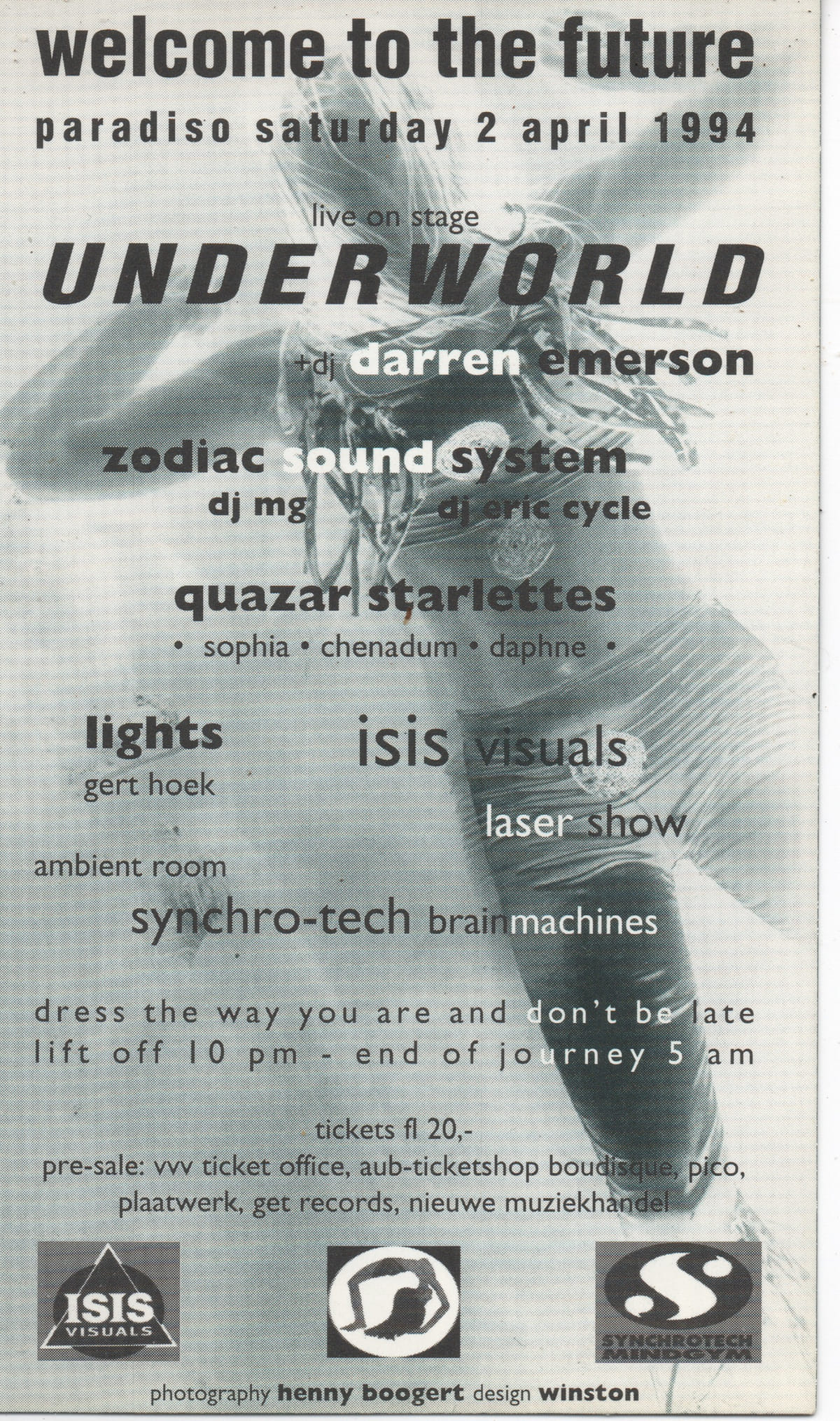 We hadden met Quazar inmiddels een eigen team opgebouwd van dj’s, licht- en geluidsmensen en danseressen. Alles wat we nodig hadden voor een feest. En we zouden voor onze feesten bevriende artiesten uitnodigen die net als Quazar live speelden. Op de eerste editie waren dat Speedy J en Orlando Voorn, en tijdens de tweede editie, in april 1994, was dit Underworld.