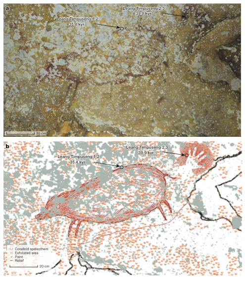 Maar die opvatting kan nu de prullenbak in. In Indonesië, op Sulawesi zijn rotstekeningen gevonden die op z’n minst zo oud blijken te zijn, als de tekeningen in Europa. En ze lijken er ook heel erg op: dieren van opzij en afdrukken van handen. Het staat in een artikel in Nature, dat deze week verschijnt, en dat geschreven is door de archeoloog M. Aubert een Australiër.