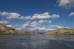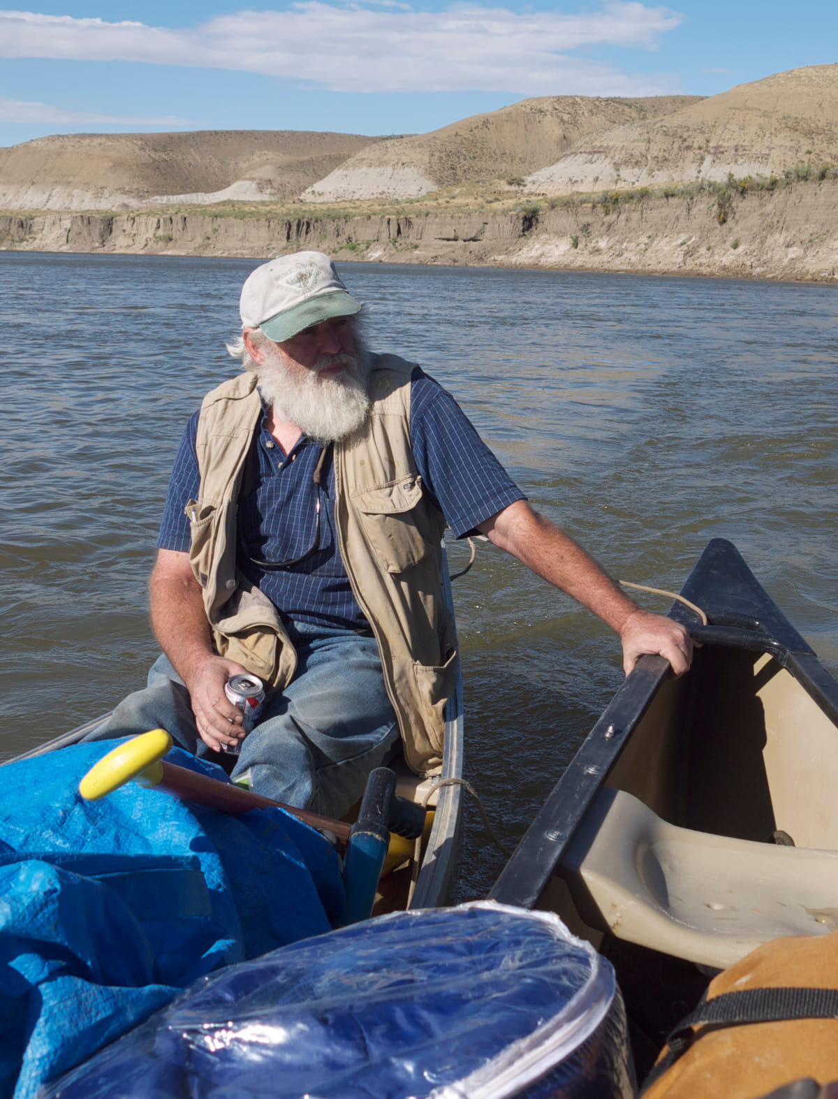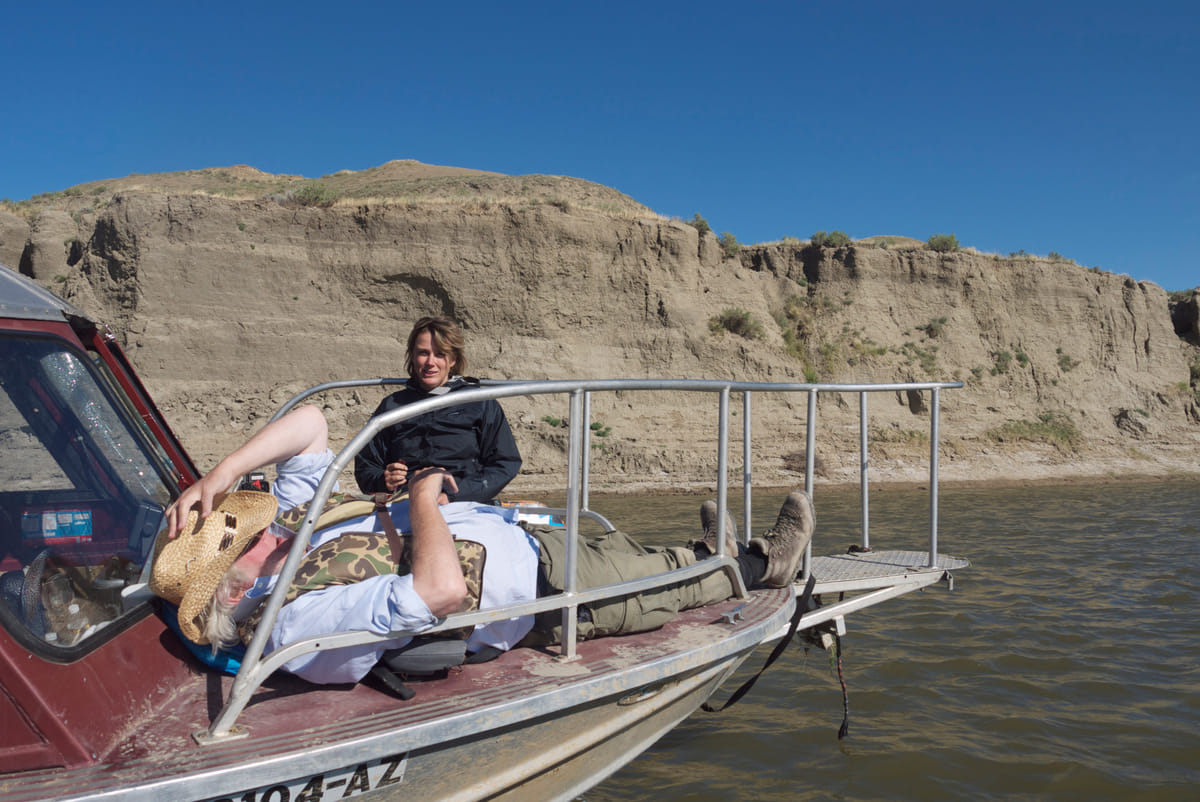 ‘Civilization’ – gevolgd door een diepe zucht. Paleontoloog Ray Rogers wijst op de snelweg waar we onderdoor varen. Onze mobiele telefoons geven trillend en rinkelend aan dat ze weer netwerk hebben, nadat we zojuist twee dagen van de radar zijn verdwenen. We zijn in Montana en varen over de Missouri River. Dwars door onherbergzame rotsformaties; door erosie uitgesleten brokken steen waar je met een levendige fantasie spitse torens en belerende wijsvingers in ziet. Af en toe kom je een dorre boom tegen, soms een toefje groen. Bij iedere bocht een ander klimaat. Trui aan, trui uit. Regenjas aan, alles uit. In je T-shirt op het dek, in de zon. Een serene stilte, het geronk van onze motorboot niet meegerekend. De filmcrew moet er aan wennen, maar dat zulke plekken nog bestaan, is geruststellend.