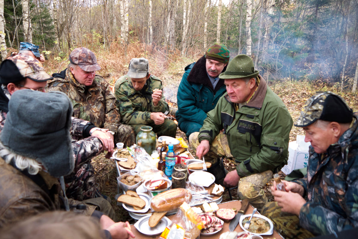 Het is doodstil, op bladergeritsel door de wind, hondengejank en schreeuwende, drijvende jagers na. De jachtopziener Valentin Konstantinovich heeft er geen problemen mee om een halve dag roerloos en stil tussen de bomen te staan, in opperste concentratie en met stoïcijnse blik, het geweer in de aanslag – business as usual voor de jagers hier. Valentin zegt dat hij en zijn jagersvrienden een op de drie keer zonder buit huiswaarts keren. Hebben ze beet, dan wordt het getroffen dier dezelfde dag verorberd bij kampvuur in het bos. De jagers waren vandaag positief gestemd omdat ze vanochtend vroeg verse sporen van wolven hadden ontdekt, en dus zijn er tassen met boodschappen meegebracht voor la grande bouffe met de Nederlandse pers.