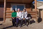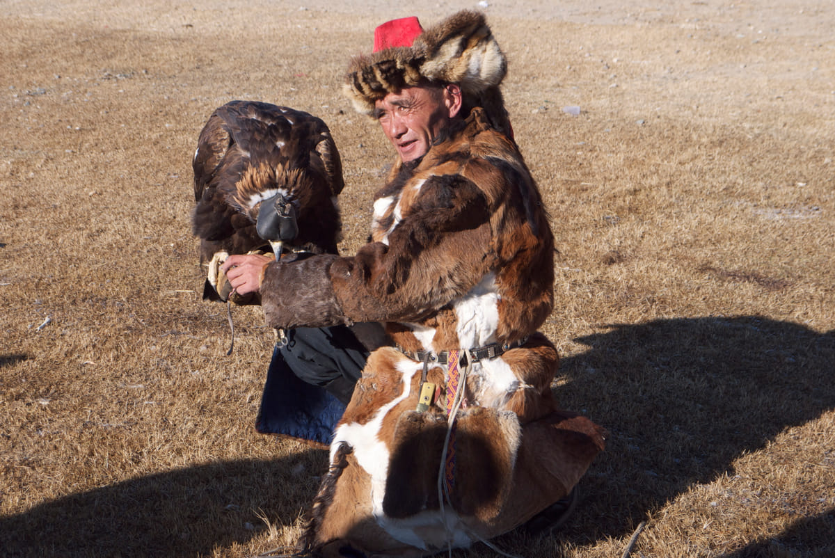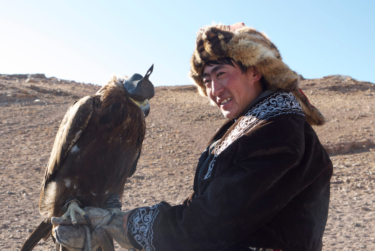 De volgende familie waar we overnachten zijn eagle hunters. Jagen met een arend op je arm. De familie woont iets ruimer dan de familie waar de nacht hiervoor hebben gespendeerd, maar leeft net zo goed in een compleet desolaat gebied. Aan de muur in de huiskamer hangt een poster van de Blue Wolf Travel Group, ‘specialists in travel to Mongolian Altai’. Het is het bedrijf van Canat, onze gids. De woning fungeert als onderdak voor de jagersfamilie zelf en als hotel voor toeristen zoals wij. De arend is gedomesticeerd. Het beest heeft een kap op zijn kop, zodat het niks ziet en superscherp en geconcentreerd is als het ding er af gaat. Als de jagers tijdens de jacht een vos of een wolf zien, gaat de kap er af en duikt het dier op de prooi, zodat er geen ontsnappen meer is. De jager doodt de buit want als de arend het doet, blijft er van de huid niets over. Mongolen maken daar bonten jassen en mutsen van. De arend krijgt als beloning een reeds overleden haas of konijn. Nu zit de arend van de familie vast aan kettingen in een hok naast de woonkamer. In zijn hok hangt een serie kadavers aan een touwtje: zijn voer. Het vak van eagle hunten gaat van vader op zoon. De vader, Mana, is inmiddels gepensioneerd en coacht zijn zoon Aibek. Die is gekleed in een traditionele ‘del’, een lange overjas met lange mouwen en manchetten die de handen bedekken, om het middel een kleurige zijden sjerp. De jas is gevoerd met bont. Aibek draagt ruige laarzen, op zijn hoofd een muts van vossenbont met flappen tot over zijn oren. Hij is 24 jaar maar oogt ouder door een verweerd en doorgroefd gezicht. Mensen worden hier niet oud, gemiddeld een jaar of vijftig.