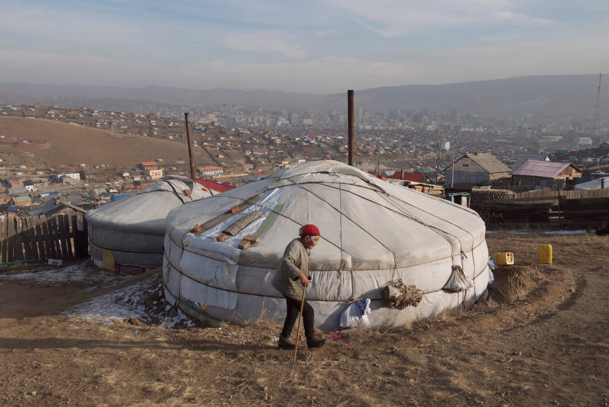 Niet dat de stad nu kraakhelder is. Volgens de gegevens van de Wereld Gezondheids Organisatie is Ulaanbaatar de op één na slechtste stad ter wereld wat betreft luchtvervuiling. De enige stad met een nog smeriger lucht is Ahvaz, zuidwest Iran. Het is zichtbaar: Ulaanbaatar is gehuld in een dikke mist; smog veroorzaakt door industrie, files en de kachels van gewone mensen. Tentbewoners; voormalige nomaden. Om de binnenstad van Ulaanbaatar is namelijk een ring van yurts. Hier wonen de Mongolen die de laatste jaren van het platteland naar de stad zijn getrokken, hopend op werk en inkomen. Veel van hen zijn voormalige herders van wie het vee is dood gevroren in de strenge Mongoolse winters. Daarmee is meteen hun hele levensonderhoud down the drain. In het midden van die tenten staat een kacheltje, waarin men behalve bruinkool alles wat maar branden wil stookt, of het nu plastic, een autoband of poep is. Voor het eerst in de geschiedenis van dit land wonen er meer mensen in de stad dan er buiten. Die trend is overal ter wereld gaande, maar voor Mongolië is het des te opmerkelijk omdat het land bekend staat om zijn nomadencultuur. Die cultuur ligt onder de druk. Behalve dat veel nomaden uit nood geboren naar de stad trekken, zien veel jongeren weinig fiducie meer in een leven als herder op het platteland. De keuze is simpel: met je Macbook bij de espressobar in Ulaanbaatar zitten of buiten moeten poepen naast je vilten tent bij min tien en met de gure wind langs je blote billen. Bij de meesten is de keuze snel gemaakt.