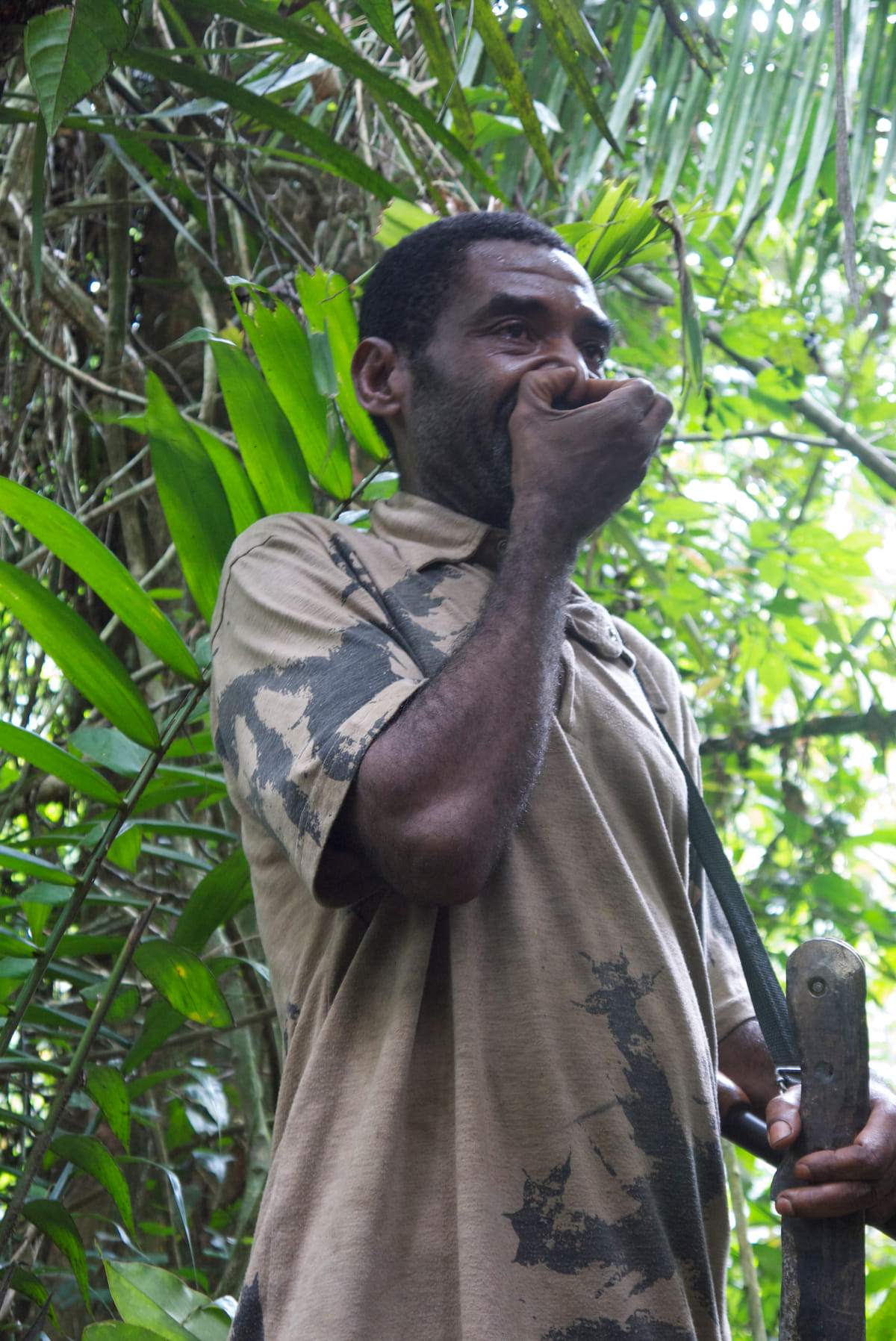 In het zuiden ligt Moukalaba Doudou, waar een Japans onderzoekscentrum is gevestigd dat we gaan bezoeken. We worden met kano’s naar de overkant van de rivier gebracht en moeten een eind lopen. O’Hanlon en ik raken achterop en dat vind ik niet prettig. De gidsen die we eerst nog in de verte zagen lopen, hebben weliswaar geen wapens bij zich, maar zij weten in ieder geval eventueel gevaar goed in te schatten. Er liggen uitwerpselen van buffels. Ik vraag aan Redmond wat ik moet doen als er toevallig eentje ons pad kruist. ‘Zo snel mogelijk in een boom klimmen. Het zijn ongelofelijk gevaarlijke beesten.’ Ik kijk naar de vegetatie. Allemaal kale stammen, echt met geen mogelijkheid dat ik daar in kom.