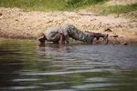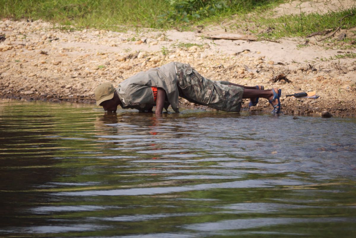De volgende ochtend staan we om half vijf op en maken een tocht langs de rivier. Het is ongelofelijk mooi gebied. Op een zandbank heeft een krokodil haar eieren begraven. Niet aankomen is het devies, een krokodil weet precies welk ei bovenop ligt, als je ze omwisselt verlaat ze het nest. Als onze gidsen een beest zien, noteren ze dat in een schrift. Een van onze begeleiders krijgt dorst en steunt op handen en voeten, benen gestrekt, en drinkt als een dier uit de rivier.