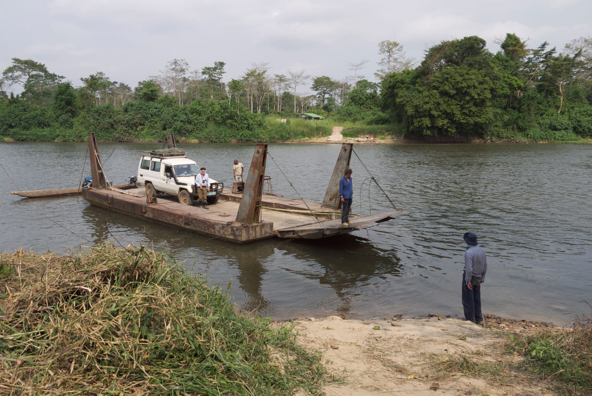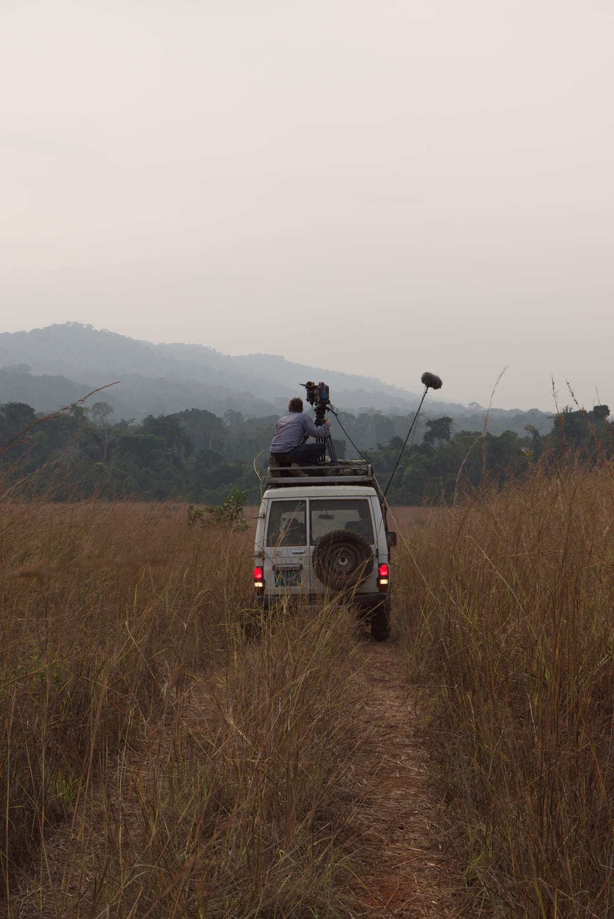 We hebben acht uur in de auto gezeten. Nog drie uur te gaan. We reizen nu verder met twee auto’s. Het eerste deel van de route is nog redelijk. Een zandweg met kuilen. Onze nieuwe chauffeur van het WWF rijdt er zonder probleem tachtig, hij weet precies waar de kuilen zitten. Af en toe remt hij heel hard af om langzaam door een groot gat te gaan. Bij de hele diepe kuilen hangt een rood/wit afzetlint. We komen bij een pont, waar we de Jeep oprijden en rollen de staalkabel op, maar we worden ook een handje geholpen door een man die met een bootje de pont voortduwt. Na de oversteek is er geen weg meer. We rijden door hoge grassen, het is ongelofelijk dat de chauffeur precies weet hoe hij moet gaan. Uiteindelijk stopt een brug ons. De regisseur zakt er met één been door, toch is hij ervan overtuigd dat we er met de auto overheen zouden kunnen rijden. Gelukkig bepaalt hij deze keer niet. Het is de bedoeling dat de mensen die verderop in het basiskamp zitten ons komen halen. Er wordt geroepen, maar niemand die ons hoort. De kikkers brullen. En de duister valt in.