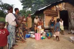 Minvoul ligt zo’n drie uur verderop. De wegen worden steeds smaller, het lijkt erop dat hoe noordelijker we komen, hoe meer we door het land worden opgeslokt. De huizen waar we langskomen zijn gemaakt van leem, golfplaat of palmbladeren en worden omringd door het karakteristieke oranje zand. Bij uitzondering staat een huis op gras, wat er meteen veel minder armoedig uit ziet. Het is de gewoonte om dierbaren in de voortuin te begraven. De graven zijn bekleed met witte badkamertegels. In Minvoul zien we een bord met de naam van ons hotel, eronder staan vijf sterren. Pas toen O’Hanlon het hotel zag dacht hij: ‘Don’t be stupid, je kunt gewoon sterren kopen en opplakken. Zoveel als je wilt.’ We zijn de enige gasten. Ik heb geluk, ik krijg een grote kamer en een badkamer met ligbad. Er staat een laag water in, met een witte vettige waas erop, er drijven drie dode wormen en op de badrand ligt een zeep met een zwarte krul van de vorige gast eraan geplakt. Omdat er hier helemaal geen stromend water is, staat naast de wc een emmer water om door te spoelen. De stank is best lastig om te negeren. Maar er ligt wel een vrolijke welkomstmat voor het bad.