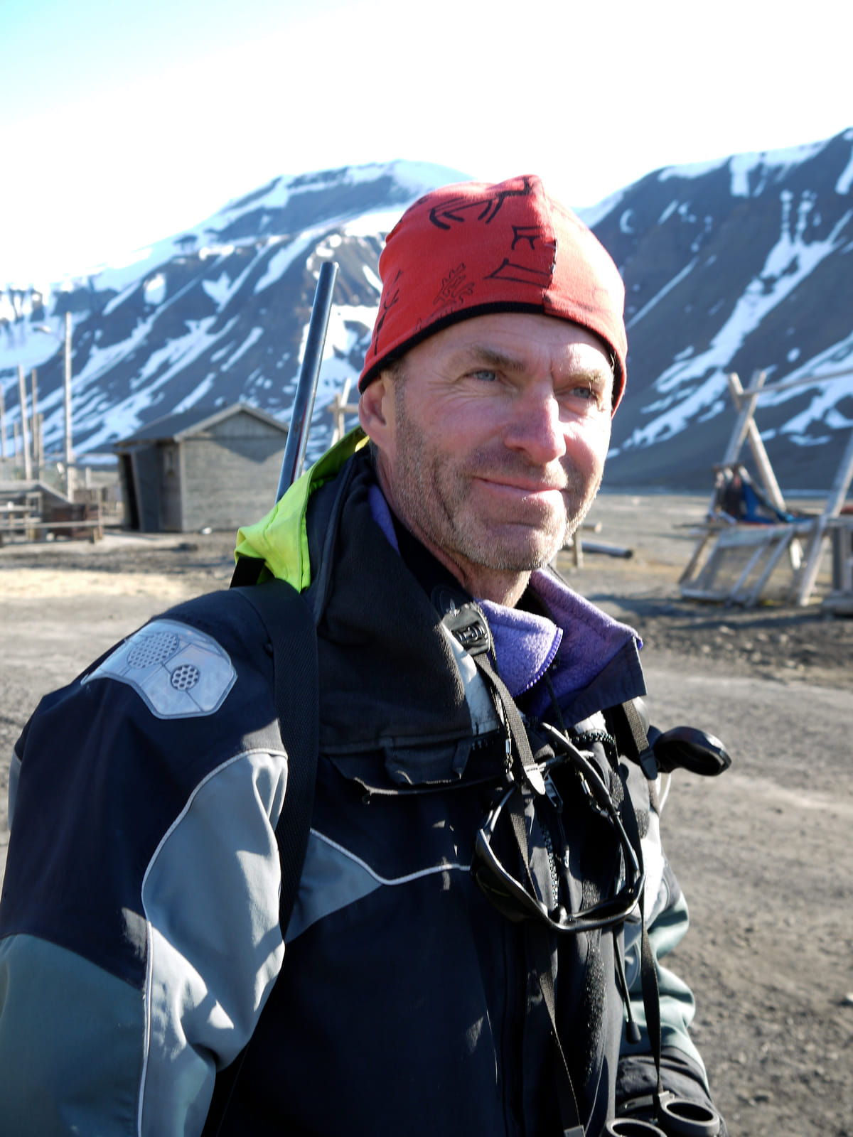 Eckblad adviseert me ook naar de burgemeester te gaan, een Andrée-specialist maar ook een drukbezet man. Misschien wil hij tijd voor me vrijmaken. Nu is het in Longyearbeyen de gewoonte om overal waar je komt je schoenen uit te trekken, dus sta ik op mijn sokken aan de balie van het gemeentehuis en vraag of de burgemeester tijd heeft. Of ik een afspraak heb. ‘I’m from Dutch television,’ bluf ik. Gelukkig vraagt de vrouw niet verder. Ja, de burgemeester heeft wel even tijd, even later zit ik koffie te drinken op zijn bank. Nu weet ik dat niet elke burgemeester beschaafd, verzorgd, en voorkomend hoeft te zijn, maar dit is wel het andere uiterste. Een eivormig hoofd, een te lange, zwartgrijze baard die er zwerversachtig uitziet, roos op zijn schouders.