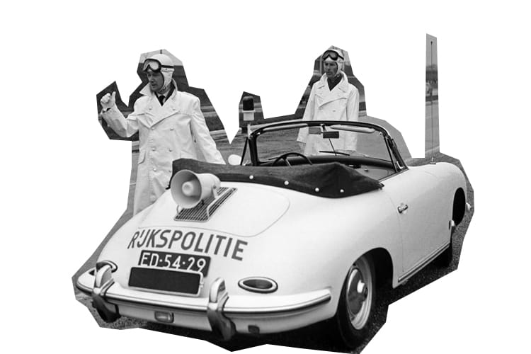 Met de groei van het autoverkeer nam ook het aantal ongelukken toe. Vooral op de nieuwerwetse snelwegen, want lang niet iedereen wist hoe je je daar moest gedragen. Genoeg werk aan de winkel dus voor de mannen van de Rijkspolitie in hun snelle en stoere Porsches. Vanaf 1962 controleerden zij het snelwegennetje. En al hadden ze niets van de ouderwetse veldwachter, hun optreden was hetzelfde: streng maar rechtvaardig. Die blitse Porsches waren niet alleen handig vanwege hun snelheid. Je kon er ook langdurig mee achteruit rijden zonder koelingsproblemen.