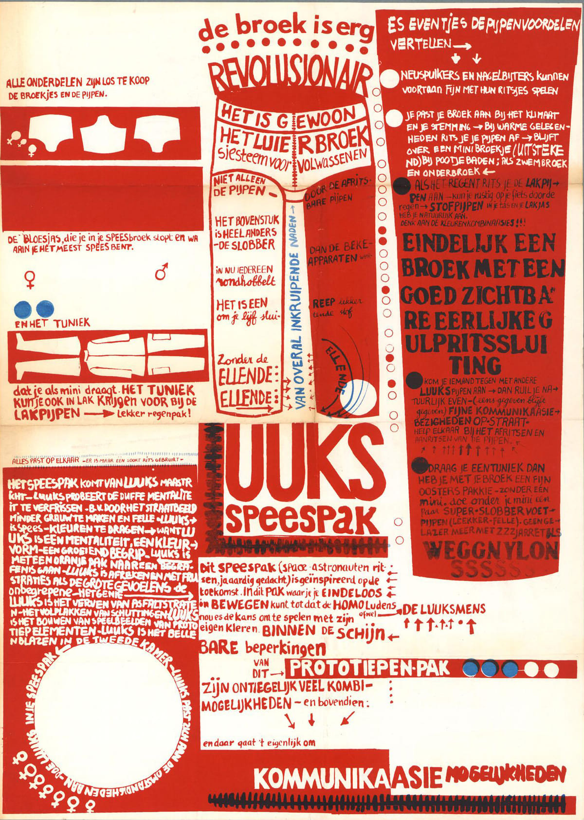 Hoogtepunt vormen de ‘speespakken’: speelpakken met afritsbare pijpen waarbij het de bedoeling is een pijp met een andere speespak-drager te ruilen – kommmunikaasie! Bekende Amsterdamse provoleden reizen naar Maastricht af om een cursus zeefdrukken bij Luuks te volgen.