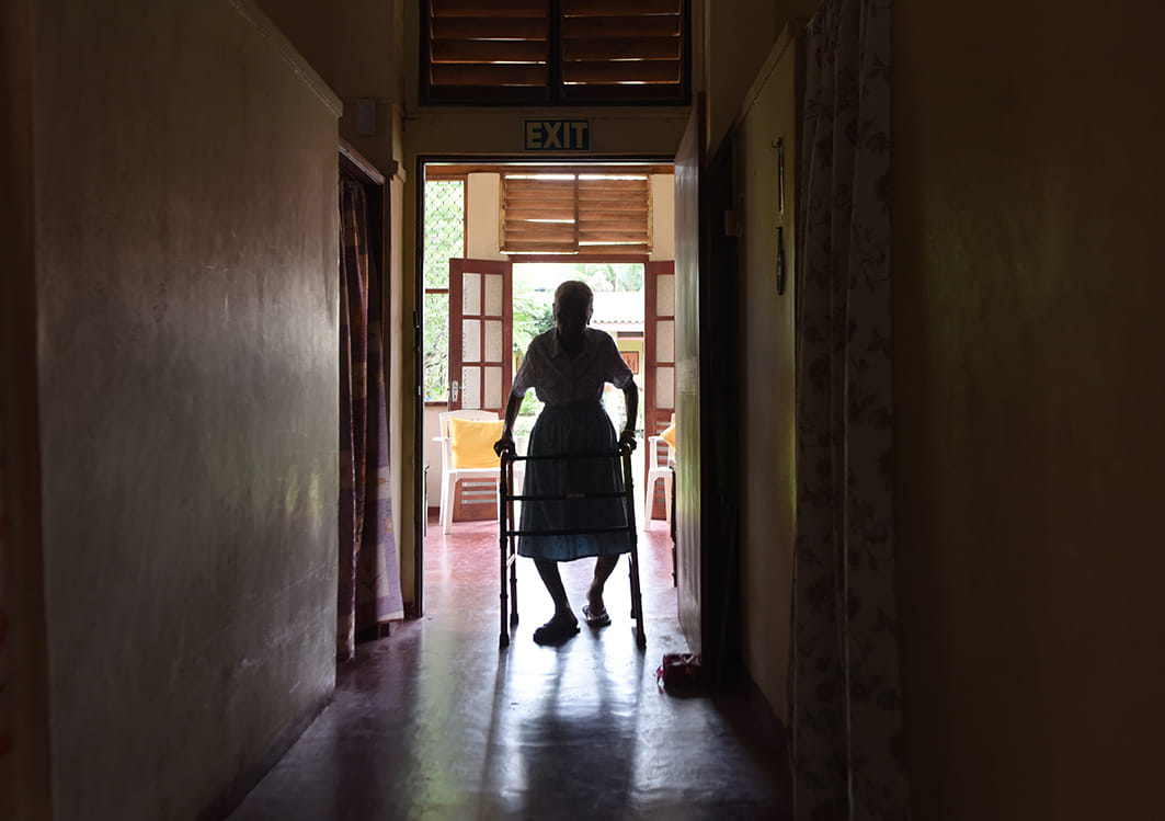Een klein vrouwtje met pretoogjes en een flinke bochel komt nieuwsgierig naar ons toe. Mevrouw Drieberg woonde tot negentien jaar geleden nog met haar moeder in een wijk verderop in Colombo. Na haar moeders dood besloot ze naar het Sint Nikolaas Huis te verhuizen.