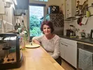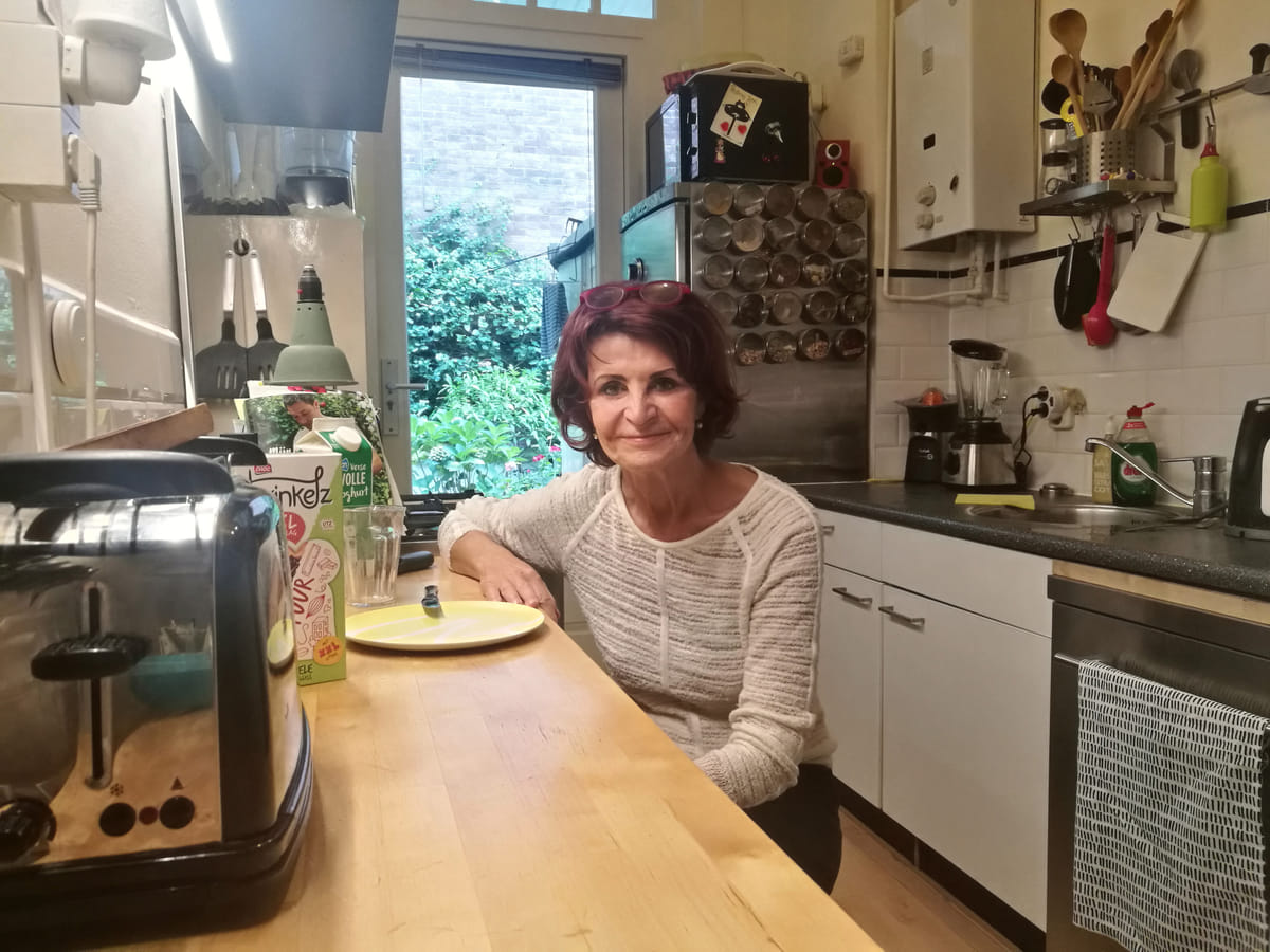 'Tegenwoordig luister ik met mijn man. Ik zit hier en hij zit naast mij op net zo’n krukje. Moet hij zijn mond houden en dat is altijd een probleem. Dan zit ik hem heel kwaad aan te kijken. Mijn keukentje is heel eenvoudig, terwijl het huis nogal ruim is. Het is ook een wereld van verschil met de grote en zonnige woonkamer. Je zou zeggen, ga lekker daar zitten, maar het gebeurt niet. Best knullig. Elke zondag zitten we hier in onze pyjama. Ik maak meestal yoghurt met allemaal gezonde vruchten en noten, en hij eet standaard een boterham met hagelslag. Verder sinaasappelsap en cappuccino. Alles hebben we hier bij de hand en dan zetten we maar weer een kopje. We luisteren en als er aanleiding toe is, kletsen we een beetje. Het ziet er heel ongezellig uit maar wij hebben het heel gezellig. Het is ook een beetje ongemakkelijk, maar daar zijn we aan gewend. Misschien zit nog ergens in mij hoofd dat de kinderen in de kamer spelen en zitten we daarom hier.'