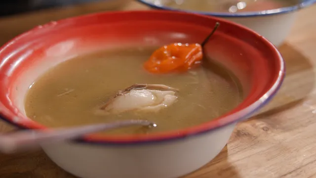 - Giet de bouillon door een fijne zeef en gooi wat er achterblijft weg. Doe 1 liter bouillon met het cassavewater en de pepers in de pan. Breng aan de kook en laat 15 minuten op laag vuur koken met het deksel op de pan.
