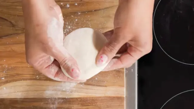 - Verdeel het rotideeg in ca. 10 gelijke porties, maak er balletjes van. Wentel er een licht in de bloem. Vorm het deegje tot een platte cirkel die goed in je handpalm past. Dat doe je door een draaiende beweging te maken waarbij je steeds aan de buitenkant iets meer drukt dan in het midden, zodat een cirkel ontstaat met een dunnere rand. Leg het deegje in je handpalm en leg er een bol aardappelpuree in, ongeveer 1 tot 2 eetlepel. Vouw het deeg dicht, zorg dat het goed sluit en vorm er weer een mooie bal van. Doe hetzelfde met de rest van het deeg en vulling en bewaar onder een theedoek.