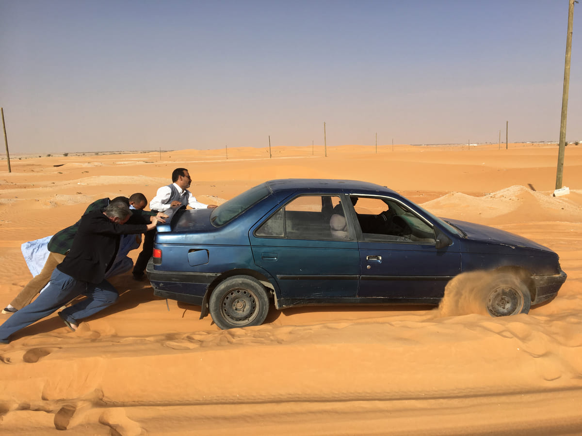 Zachte banden hebben namelijk meer oppervlak en laten zich minder snel ingraven. ‘Maar eigenlijk moet je natuurlijk helemaal niet met zo’n auto de woestijn in, maar met een four wheel drive. Het grappige is dat je in Mauritanië veel van dit soort auto’s tegenkomt: oude BMW’s en Mercedessen, die ook uit Nederland komen. Dat is nog wel een interessant verhaal voor de volgende keer, wat er met die auto’s gebeurt.’