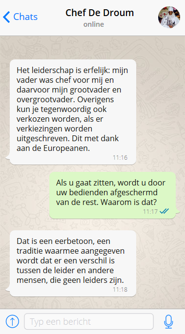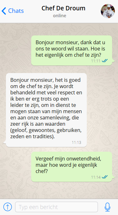 In deze aflevering maak je kennis met de dorpschef van Droum, het eerste aanspreekpunt als het gaat om familietwisten (bijvoorbeeld in het kader van landverdeling), huwelijksproblemen of andere beslommeringen. Hij bemiddelt en, indien nodig, beslist. Die functie bekleedt hij niet alleen voor zijn eigen dorp, maar voor het hele gebied: als een soort rijdende rechter regeert hij over nog eens ruim zestig andere dorpjes. Daarin blijft hij uitstekend bij de tijd: de chef is gewoon te appen. De webredactie van Sahara stelde hem een paar vragen.