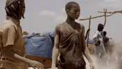 ‘Ik had het daarbij in mijn hoofd gehaald om achterop die vrachtwagen een kraan maken, een lange zwenkarm, maar dan met simpele middelen. Zo hadden we een houten balk van vier meter gekocht en op mijn statief geplaatst en dat dan weer met spanbanden vastgezet. Aan de ene kant kwam de camera te hangen, aan de andere een contragewicht. Daarvoor hadden we een jerrycan met water, maar die was de fixer vergeten mee te nemen. Toen kwamen de chauffeurs aan met wat plastic tassen, met scherpe kiezelstenen.’