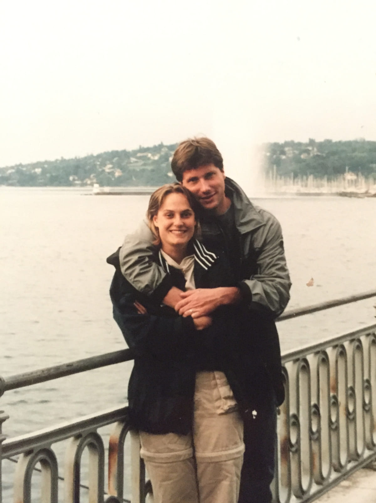 ‘Uiteindelijk zaten we dus dicht op elkaar in de klas en ook nog allebei op korfbal. Ik ging toen een keer met hem mee naar een training, bij hem achter op de fiets. Hij had eerst nog een ander vriendinnetje, maar dat was toen net uit. En maar vissen naar wie ik dan leuk vond. Nou, ik vind jou eigenlijk wel leuk. En toen was het aan. Soort van aan. Nu zijn we ruim 25 jaar verder.’