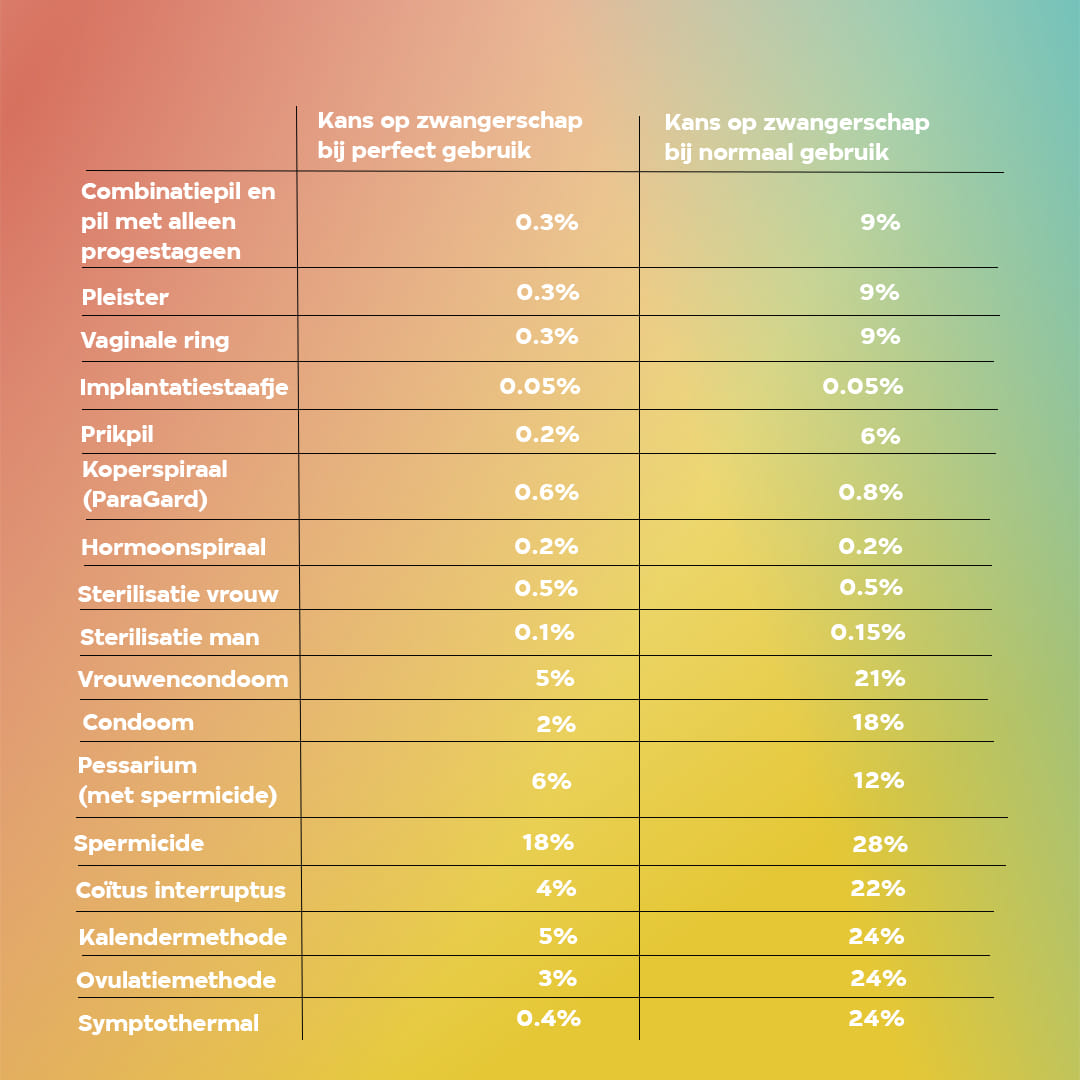 Meike vond trouwens ook nog cijfers over de betrouwbaarheid van andere anticonceptiemiddelen. Deze zie je hiernaast in een tabel. Naast 'perfect gebruik', waarbij het middel dus helemaal perfect wordt gebruikt, zie je ook een kolom met 'normaal gebruik'. Dat betekent dat er bijvoorbeeld ook rekening wordt gehouden met dat je wel eens een dagje vergeet de pil te slikken, dat je condoom scheurt of dat je soms ziek bent, waardoor sommige anticonceptiemiddelen minder goed werken.