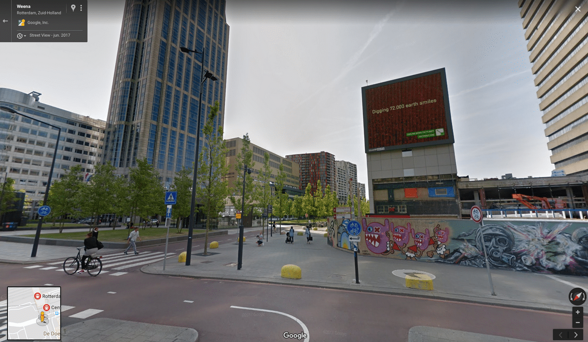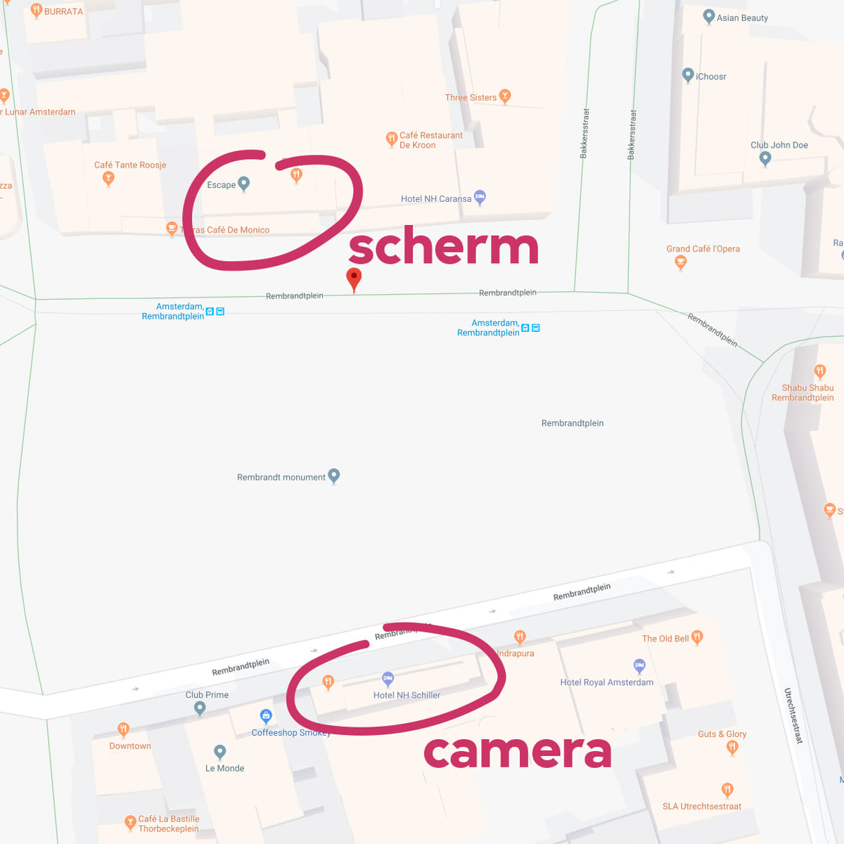 VOICE OVER MEIKE: Ik bel met blowUP om meer te weten te komen over hun camera’s. De eerste die ik aan de lijn krijg is Wouter van Beek. Zijn officiële titel, wat het ook precies mag zijn: development director digital. Ik vraag het hem op de man af: welke camera’s hebben jullie en wat kunnen ze zien? Zijn antwoord: in Rotterdam hangt geen camera onder het scherm. Wat ik gezien heb is een lege huls. Die hangt er vast voor als ze in de toekomst interactie willen met voorbijlopend publiek. Als je dan bijvoorbeeld zwaait naar het scherm, gebeurt er wat op dat scherm. Aha… En in Amsterdam? Die op het hoteldak? Daar staat volgens Wouter helemaal geen camera van blowUP. Nu vraag ik door want op Twitter had ik een foto gevonden van een adverteerder. Aan het perspectief kun je zien dat de foto vanaf het hoteldak genomen is. Check je app. Ok, Wouter geeft toe dat er inderdaad een foto vanaf het dak genomen is, maar een fotograaf zou volgens hem er speciaal voor het dak op geklommen zijn.