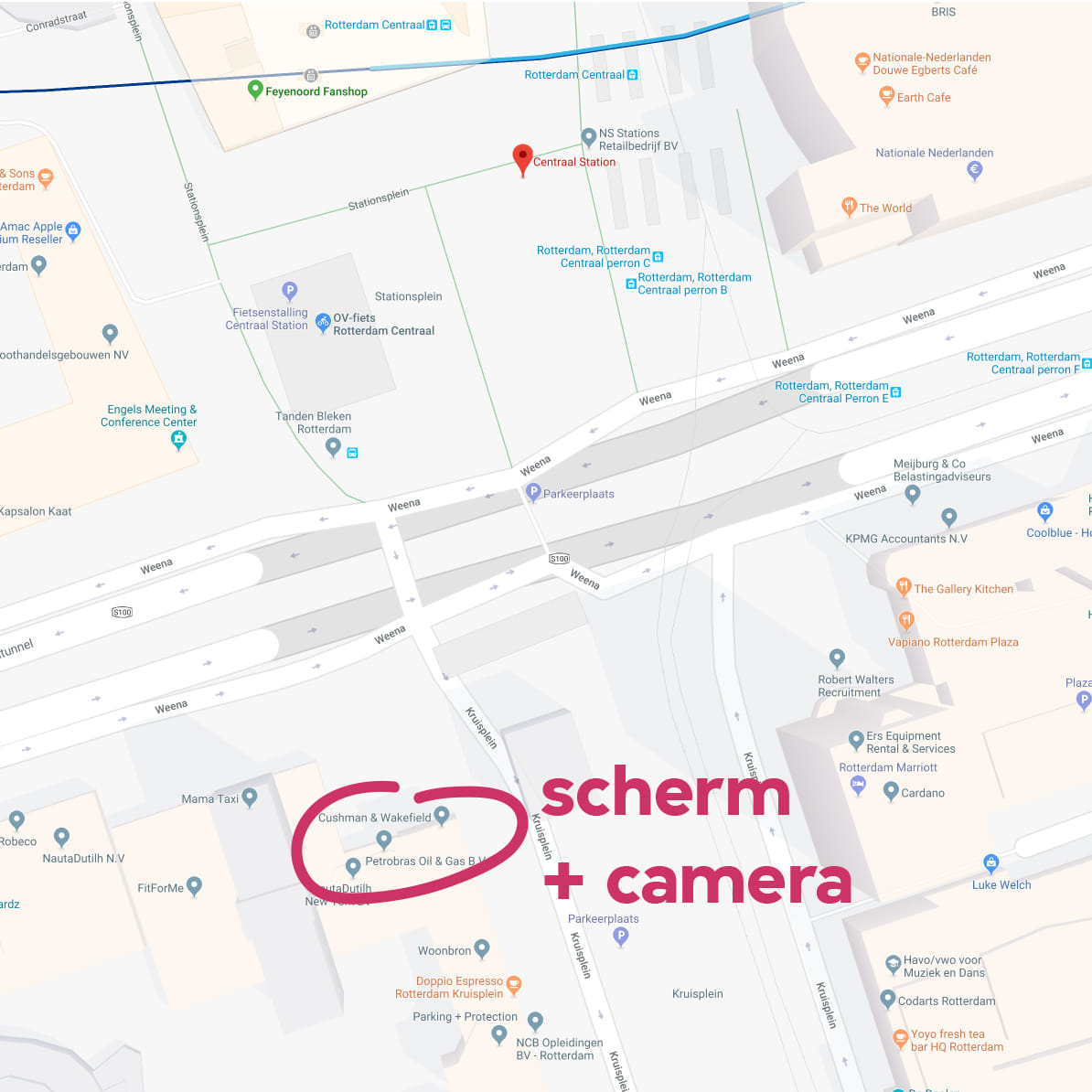 VOICE OVER MEIKE: Wil die camera ook eens zien? Kijk dan nu in je app voor wat foto’s. En in Rotterdam hangt ook zo’n camera, op het stationsplein. Daar hangt namelijk ook een scherm van blowUP en daaronder hangt dus weer een camera. In de app zal ik ook even een kaartje zetten zodat het wat duidelijker wordt waar ze staan. Maar de vraag is nu: wat zien die camera’s van ons? Komen er mensen herkenbaar in beeld? Wat gebeurt er met die beelden? En waarom staan die camera’s daar eigenlijk? En wie weet dat beter dan blowUP zelf?