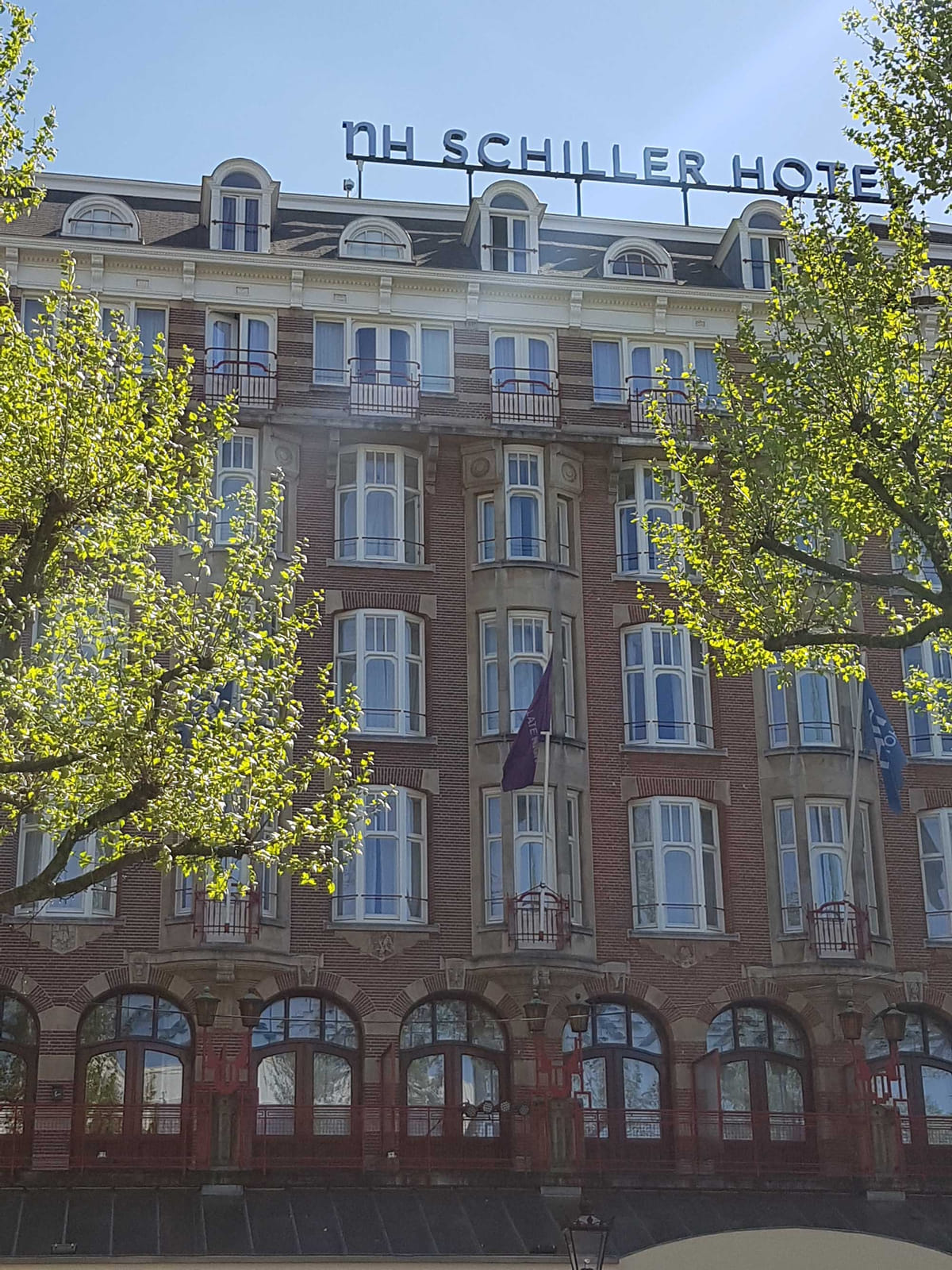 MEIKE: Die kun je best goed zien vanaf hier. Je moet alleen wel weten dat het een camera is. Bovenop het dak staan hele grote letters: NH Schiller Hotel. En links, onder de N, zie je een camera. En het is eigenlijk zo’n dome-camera. Ik weet niet of je dat iets zegt? Dat is zo’n camera, een bolletje. Die helemaal rond kan draaien. Hij is dus redelijk groot. Daarom kan ik hem vanaf hier zien. Want ik sta nu aan de overkant van het plein.
