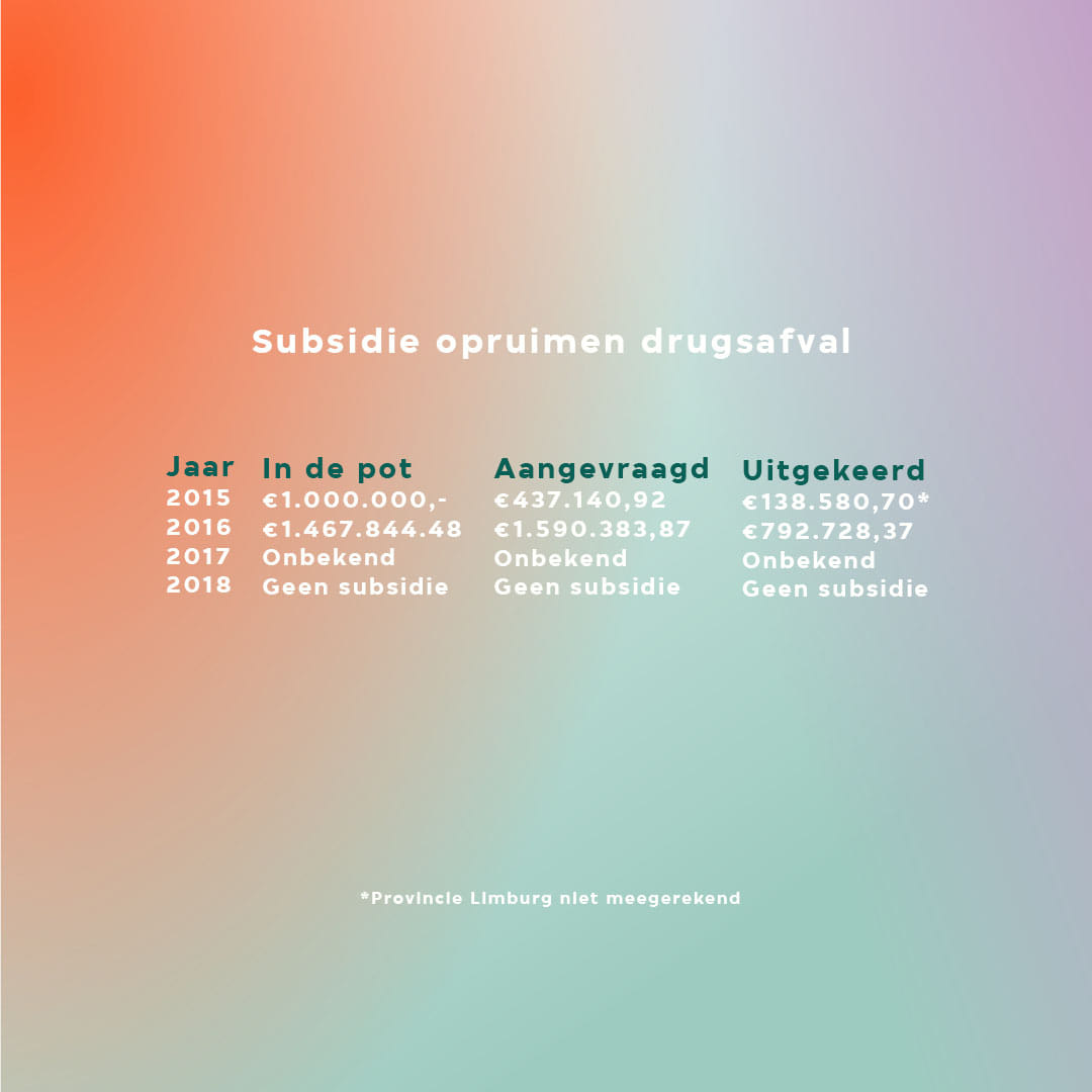 JOS HEIJMANS (BURGEMEESTER WEERT): Nou, de echte kosten van de laatste 2,5 jaar die kan ik zo ongeveer wel opnoemen: in 2016 waren we 124.000 euro kwijt, alleen al aan het opruimen van de drugsdumpingen. En dat is dan wel exclusief alle personele inzet. Dus dat zijn echt puur de kosten om het op te ruimen en vernietigen, zeg maar.