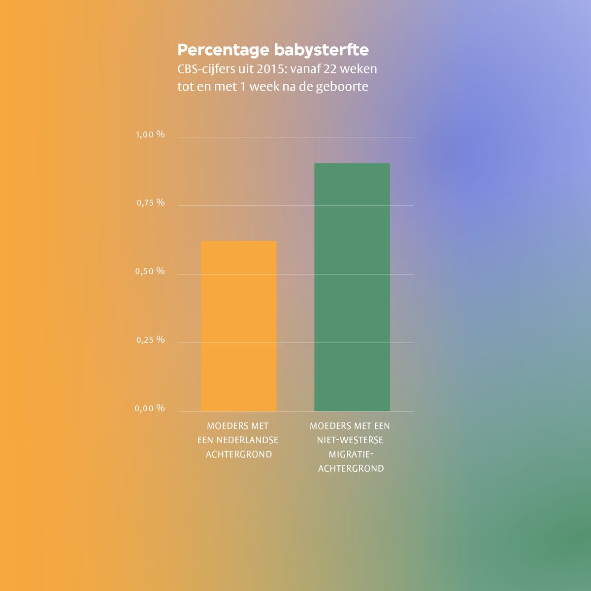 VOICE-OVER MEIKE: Check nu je app voor de cijfers! Als we naar de vijf meest recente jaren kijken, heb je gemiddeld 44,5% meer kans dat je baby overlijdt als je bijvoorbeeld Turks, Surinaams of Marokkaans bent, dan wanneer je Nederlands bent. Om dat in even in context te plaatsen: als je bijvoorbeeld ongezond leeft en als je rookt tijdens de zwangerschap heb je 50% meer kans dat je kind overlijdt.