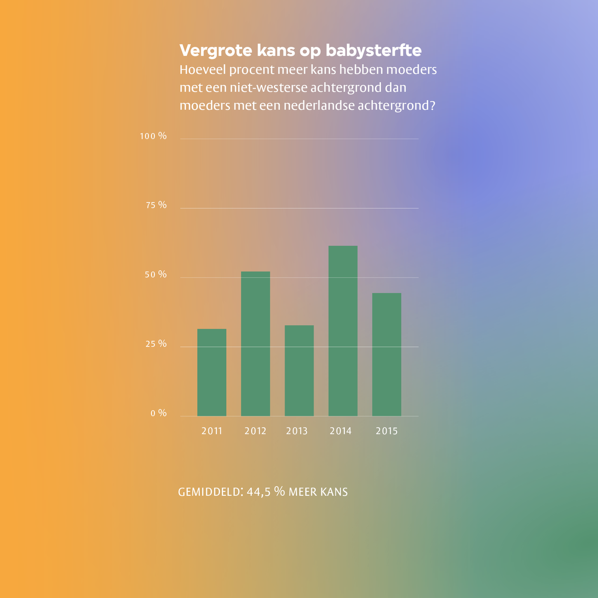 ANNELIES (RESEARCHDESK): Dit betekent dat je meer dan 31 procent meer kans hebt dat je baby overlijdt als je een Niet-westerse achtergrond hebt.Ok, dat is best wel veel.Ja, dat is een groot verschil. En we kijken nu natuurlijk naar 2011. Maar dat schommelt ook door de jaren heen. 2012 is het dus 52 procent. Weer 32. 61. 44. Nou ja, dat is niet een heel stabiel getal. Maar wel duidelijk flink hoger.