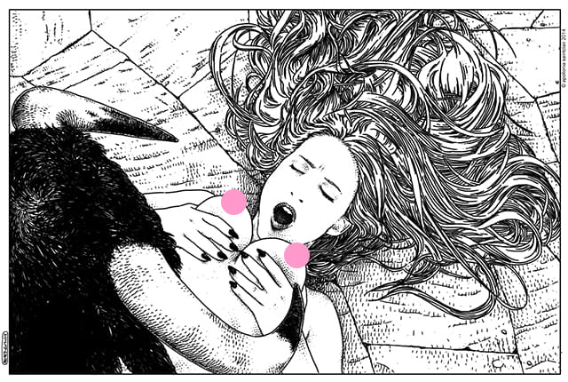 ‘Apollonia Saintclair maakt grafische illustraties van seksuele fantasieën. Wie zij is, is onbekend – ze heeft weleens in een interview gegeven, maar verder houdt ze zich op de achtergrond. Het enige dat ik weet is dat ze er nog een dagbaan bij heeft: dit is haar night job. Overdag verdient ze geld, ’s avonds maakt ze expliciete illustraties. En die zijn heel tof, mede omdat het meestal in zwart-wit is. Je kan er zo zelf je eigen invulling aan geven; de illustratie vertelt niet meteen het hele verhaal. Jammer genoeg moet ze op Instagram haar werk altijd censureren, maar op haar Tumblr kun je gelukkig wel alles zien.’