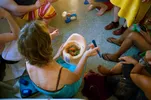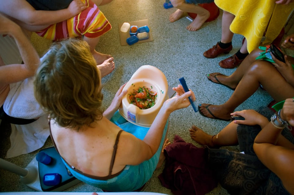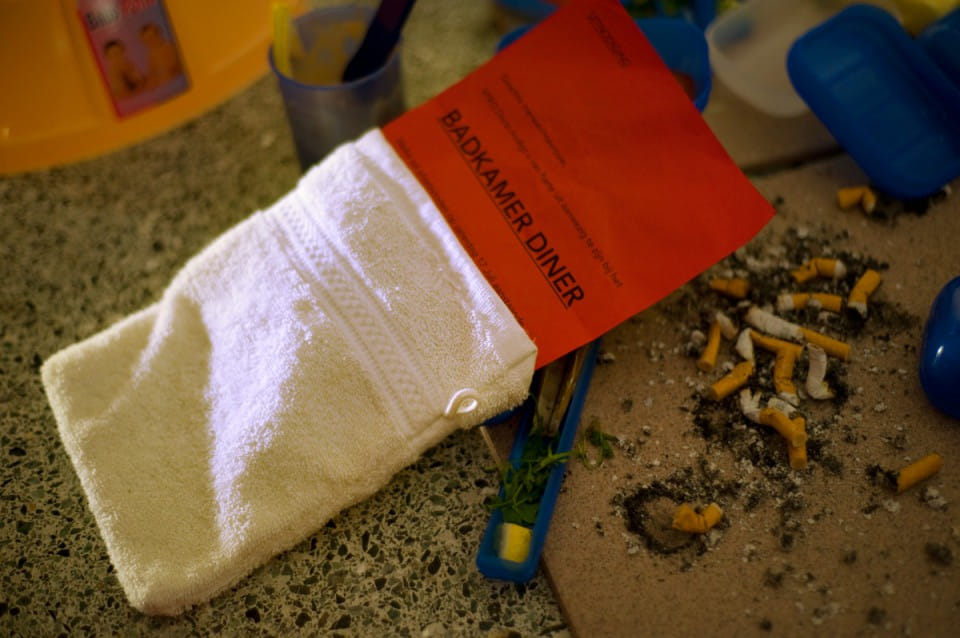 Een happening in een badkamer. Alle attributen in stijl van een badkamer. Dus geen stoelen, maar omgekeerde emmers. Geen messen maar scheermessen. Geen schaaltjes maar zeepbakjes. Er werden visgerechten geserveerd en alle gasten moesten in enkel een handdoek komen. De uitnodigingen kwamen in washandjes bij de buurtbewoners aan.