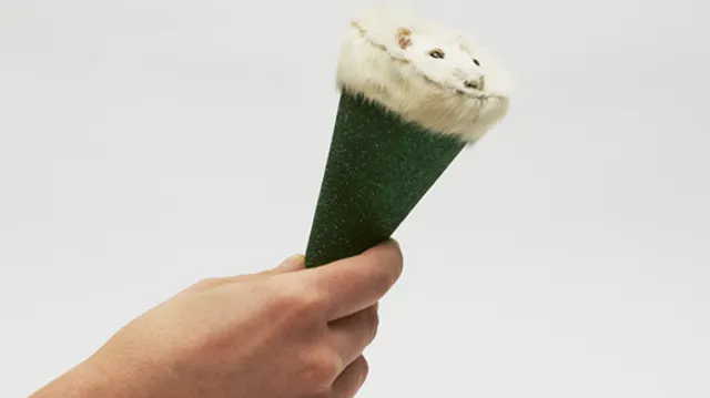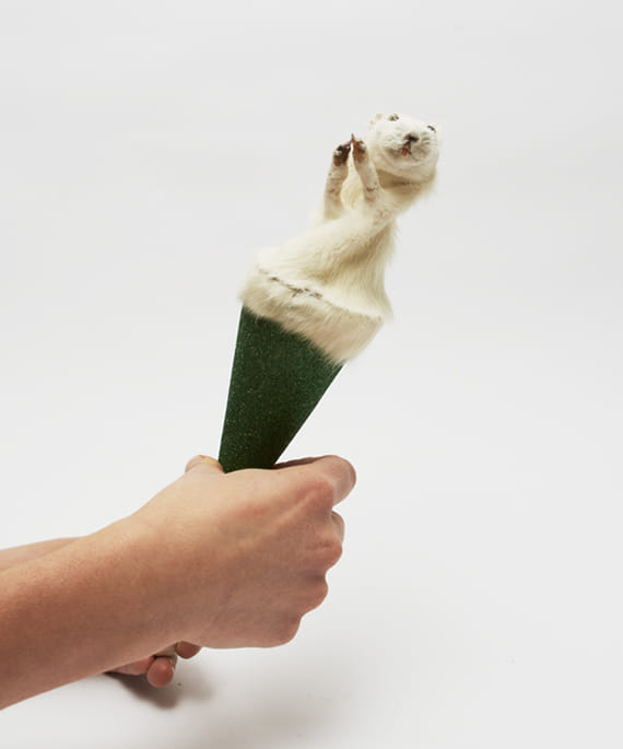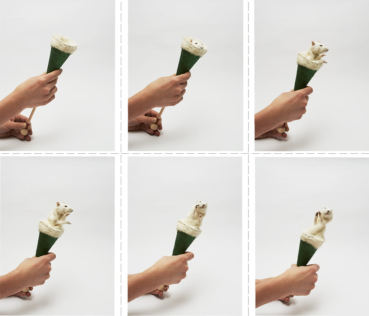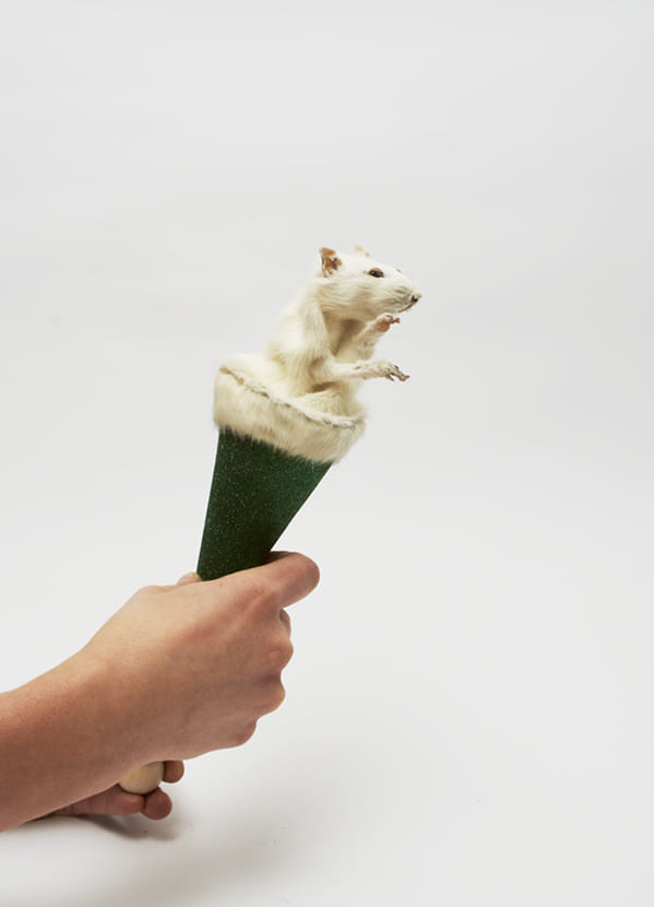 Zoals je merkt: het werk van kunstenaar Noortje Zijlstra roept veel vragen bij me op. Aan de andere kant spreekt haar werk voor zich. Het is haar geniale donkere humor die direct iets met me doet: een witte rat als een trekpop, twee ganzenkoppen die met de hals aan elkaar genaaid zijn, een vloerkleed van de huid van een rat, een eekhoorn als kaarsenstandaard. En ik hoor mezelf denken ‘het zal toch niet...’ als ik op haar website de pagina ‘beschuit met muisjes’ open. Het zal dus wel.