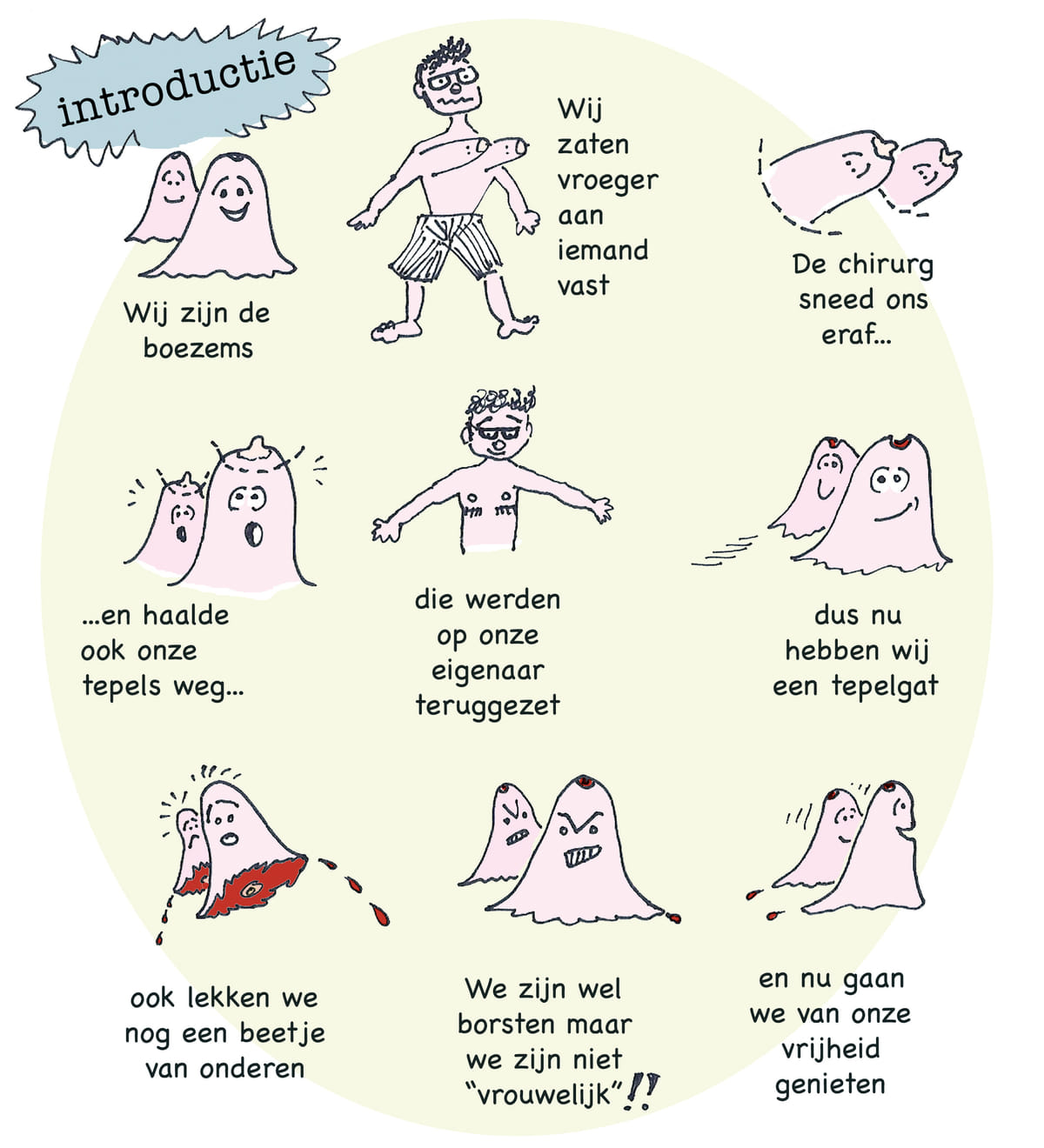 De categorieën man en vrouw maken het leven lekker overzichtelijk, maar niet iedereen voelt zich thuis in die tweedeling. Kunstenaar Jiro Ghianni is transgender en begon kort na zijn operatie een stripserie over zijn boezems, die alles behalve vrouwelijk zijn. De twee ontsnapte lichaamsdelen geven brutaal commentaar op actualiteiten maar vooral ook op genderstereotypen.