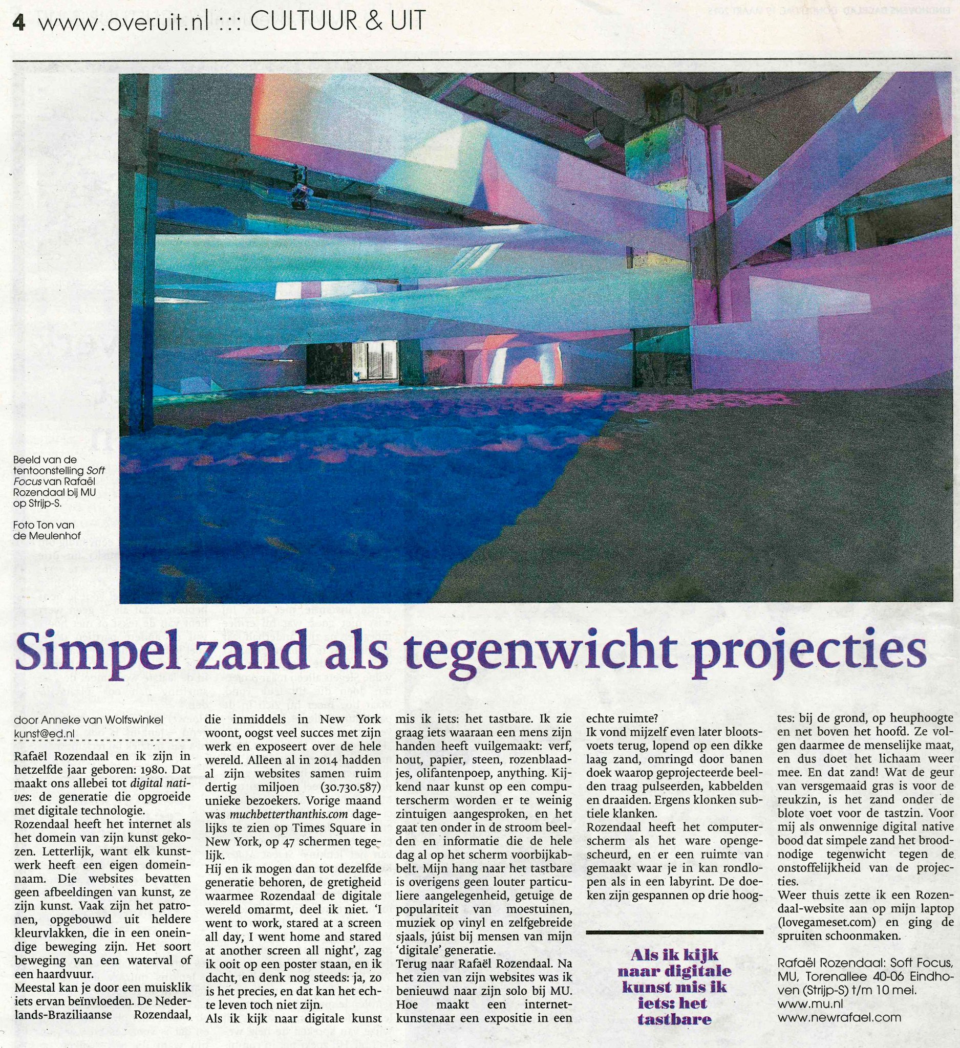 Momenteel is er een expositie van het werk van Rafaël Rozendaal bij MU in Eindhoven. Bij Soft Focus kun je tot 10 mei ervaren hoe zijn digitale kunst tot leven komt in een fysieke wereld. “Rozendaal heeft het computerscherm als het ware open gescheurd, en er een ruimte van gemaakt waar je in kan rondlopen als in een labyrint,” aldus een recensent in het Eindhovens Dagblad.