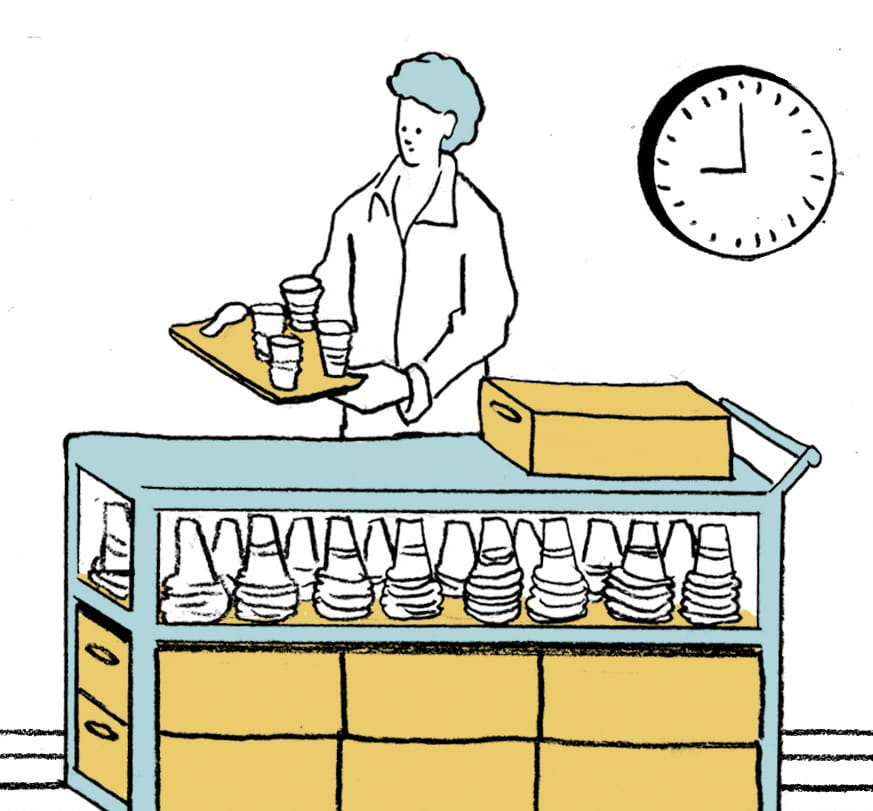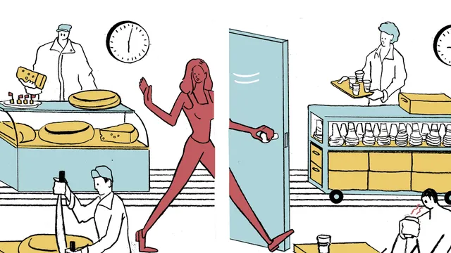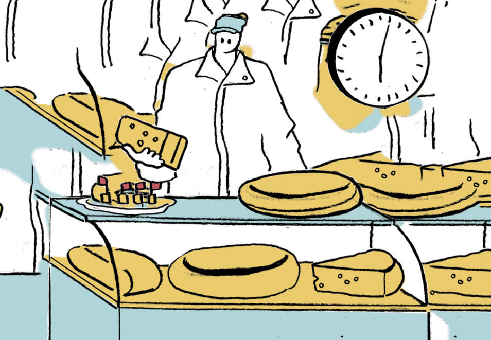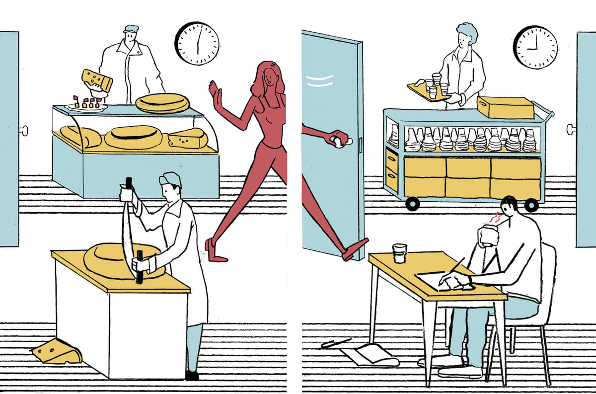 Als ik om 08.00 de kaaswinkel binnenkom, staat de zaak vol met opgestapelde kratten. Een norse man tilt dikke, vacuümverpakte hammen over de toonbank die mijn collega aanpakt. Ik loop naar achteren om een bodywarmer aan te trekken en het Senseo-apparaat aan te zetten. Zodra ik uit zicht ben, zegt de man spottend “Ze weet wat het belangrijkste van de dag is, toch?”. “Volgens mij is ze al koffie aan het zetten.”